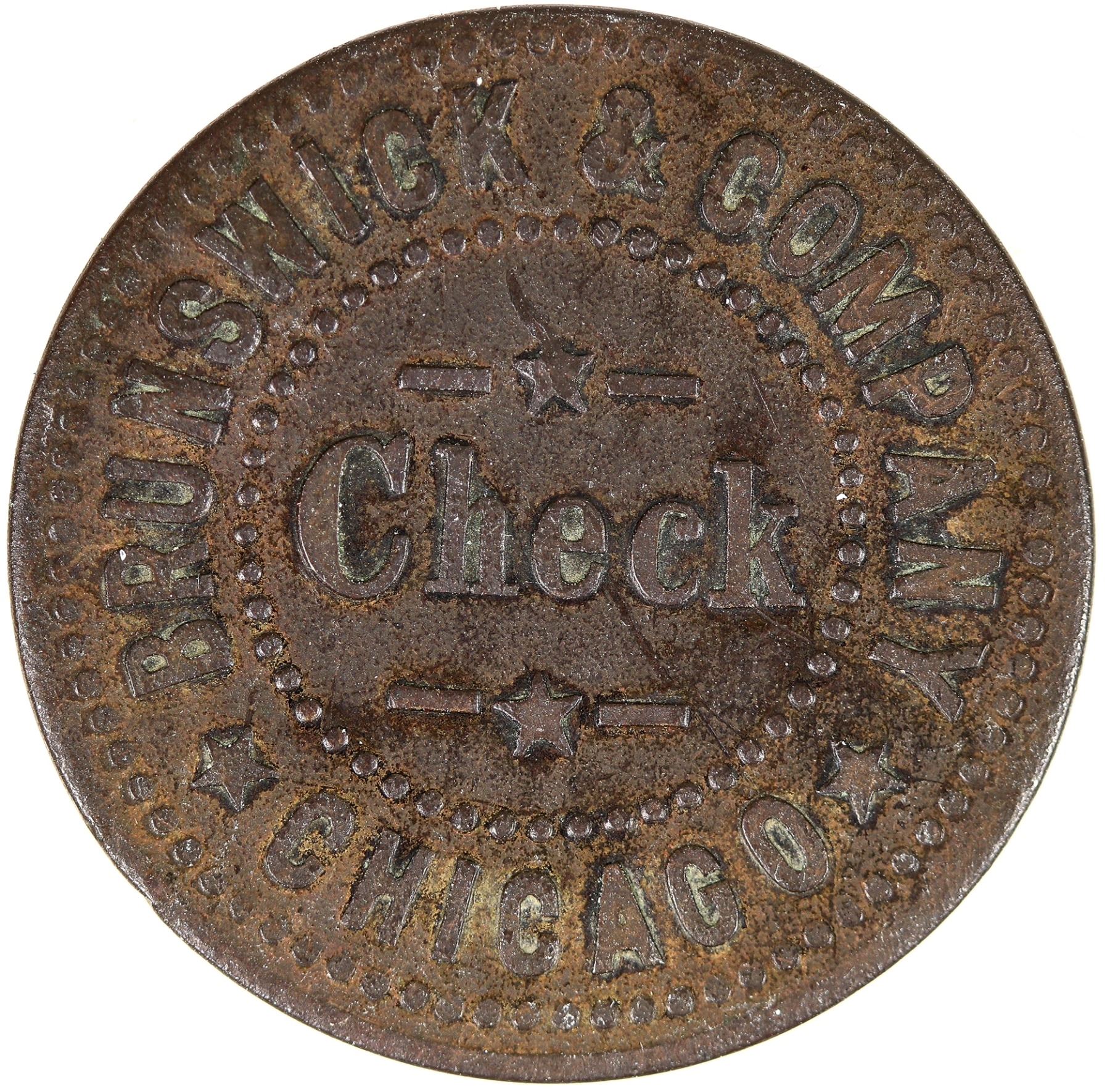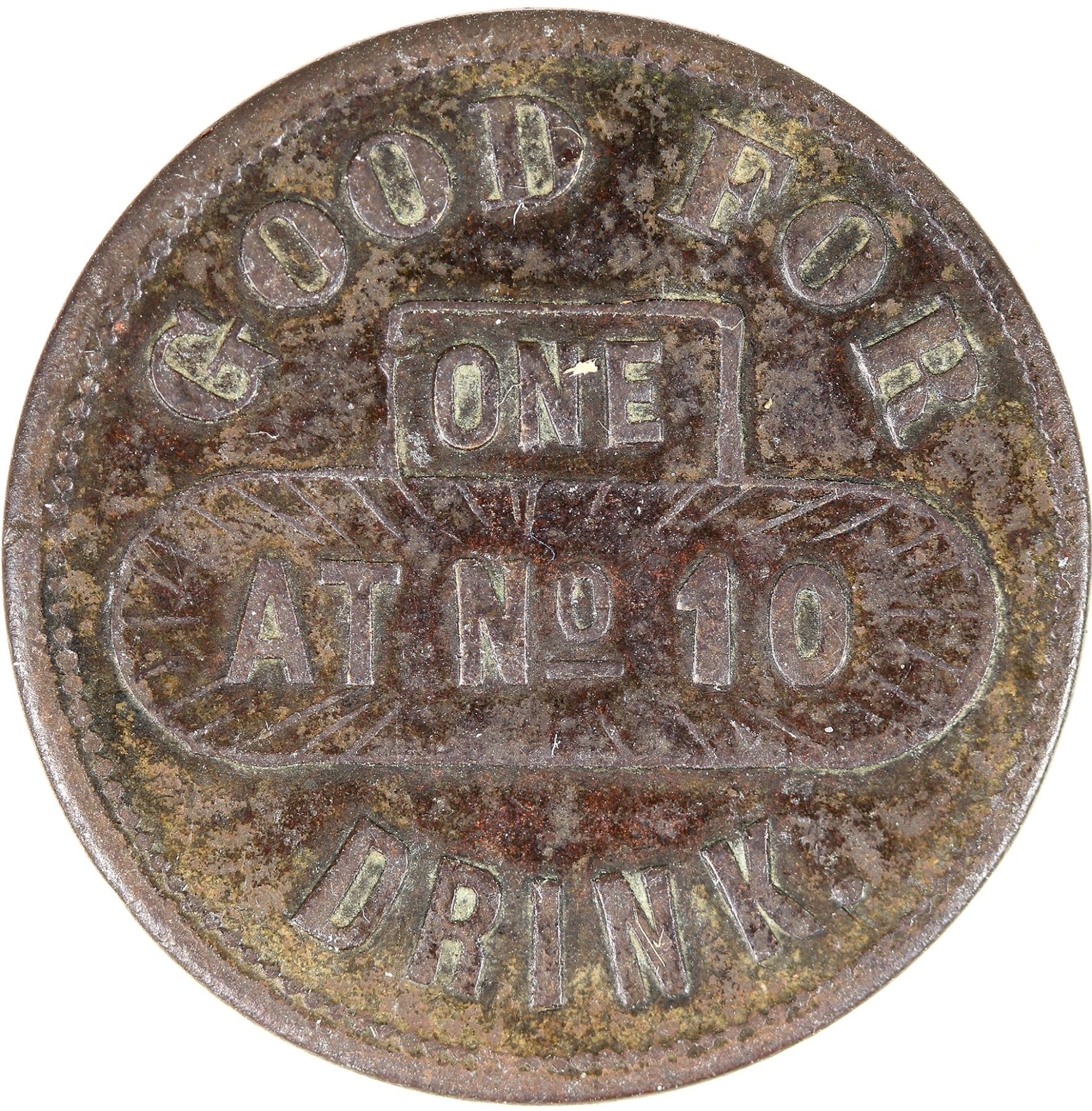 The only "No. 10" saloon FH could find anywhere is the famous one in Deadwood South Dakota where Wild Bill Hickok was shot by Jack McCall, August 2, 1876. Is this the same place? The token is a Brunswick reverse, circa 1878-1882. The date fits. If this is Dakota, this is a major piece. Good For / One / At No. 10 / Drink // Brunswick & Company / Check / Chicago; Br., rd., 24 mm.