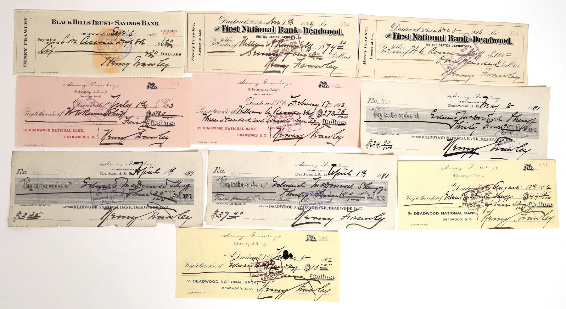 Lot of 10. Unfortunately no Seth Bullock. Includes: five checks for Edward McDonald (1891-2); three for William A. Reamer (1893-6); and one for CM Cessna (1911). McDonald came to Deadwood in 1879. In addition to being a successful Deadwood businessman, he also served five terms as fire chief for the Homestake Hose Company, helped organized and played on Deadwood's first baseball team, served as Lawrence County Sheriff (1892), served two terms as mayor of Deadwood (1902), and then later was the Deadwood postmaster until he died in 1922.