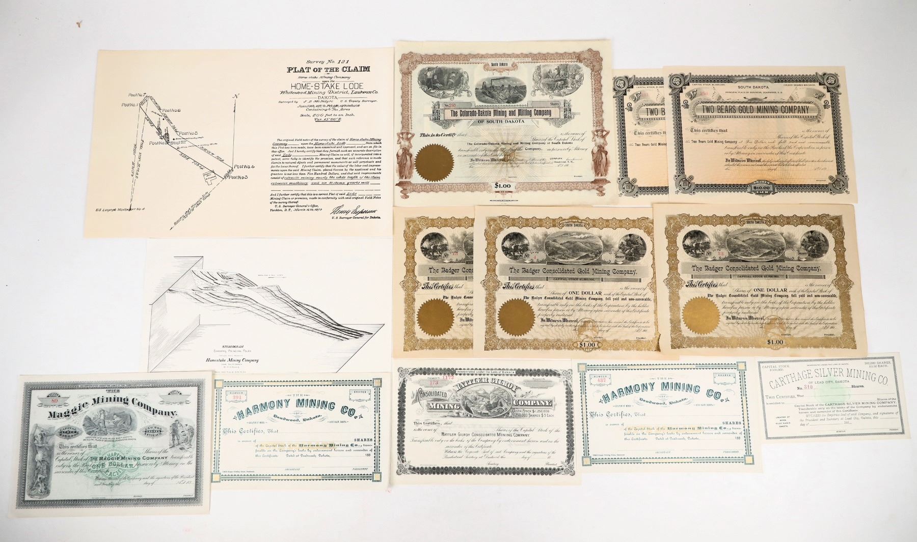 Deadwood South Dakota Homestake Mining Ephemera. Copy of the original Homestake Lode Claim certificate, stereoview of underground ore zone, 11 unissued Deadwood Stock Certificates.