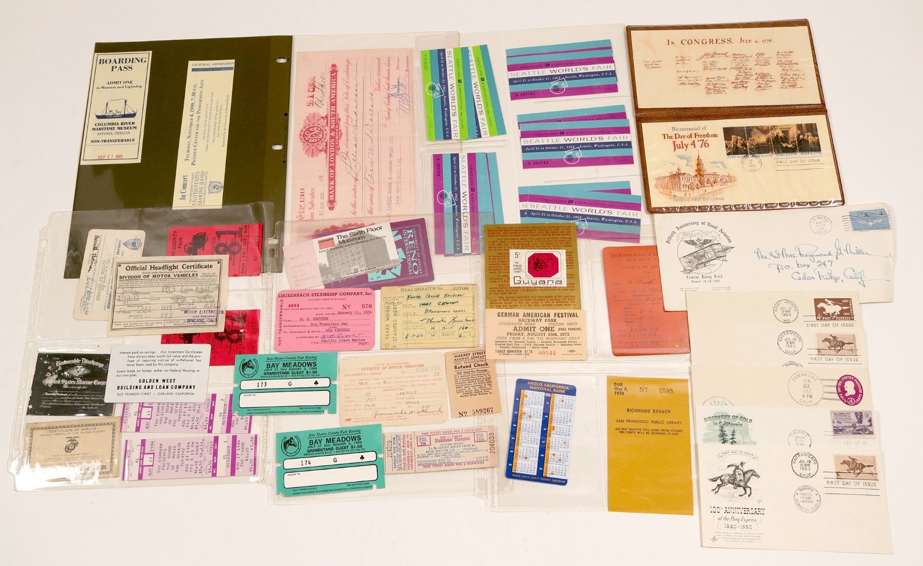 Large miscellaneous group: 7 First Day Covers, including Bicentennial and 1960 Pony Express Centennial; 1947 Note of Exchange from San Salvador Bank of London & South America; seven plastic pages of tickets, motor vehicle licenses, Seattle World's Fair tickets, Bay Meadows.