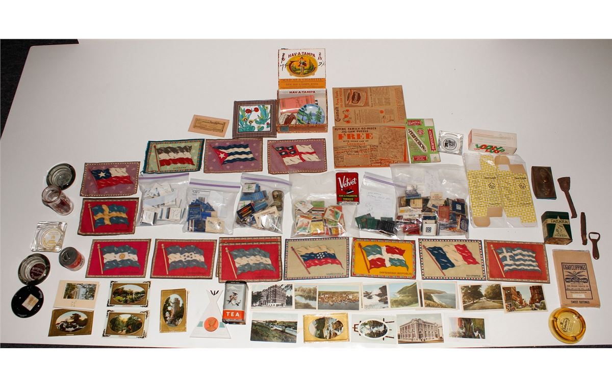 Dealer's lot of Americana. Match book collection (c1940's), a small group old collectible California ashtrays, chewing tobacco bags, old medical boxes for medicine, bottles, collectibles, artifacts, post cards. One file storage box.