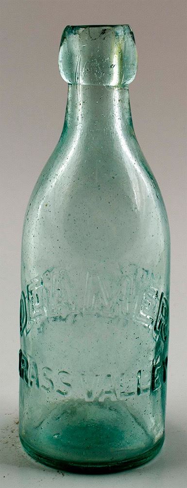 Deamer / Grass Valley // Reverse : ( Block letters ) W. E. D. 1870's-1880's : Pale aqua. Slight inside cloudiness , and one are of light scratching, near the left mold seam . Otherwise a nice Specimen. No chips , cracks, flakes or dings. Date: Location: Grass Valley, California HWAC# 30451