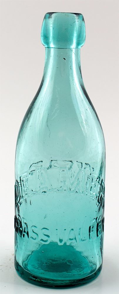 Beautiful Deamer applied top soda bottle, with "W.E.D." on reverse. medium aqua, sparkling pristine. c1875. Deamer came to California for the gold rush in 1851. He moved around the central mother lode region with the soda business and stopped in Grass Valley where it appears he stayed for at least two decade. Classic Mother Lode mining region soda bottle. State: California City: Grass Valley Date: FHWAC#: 30442