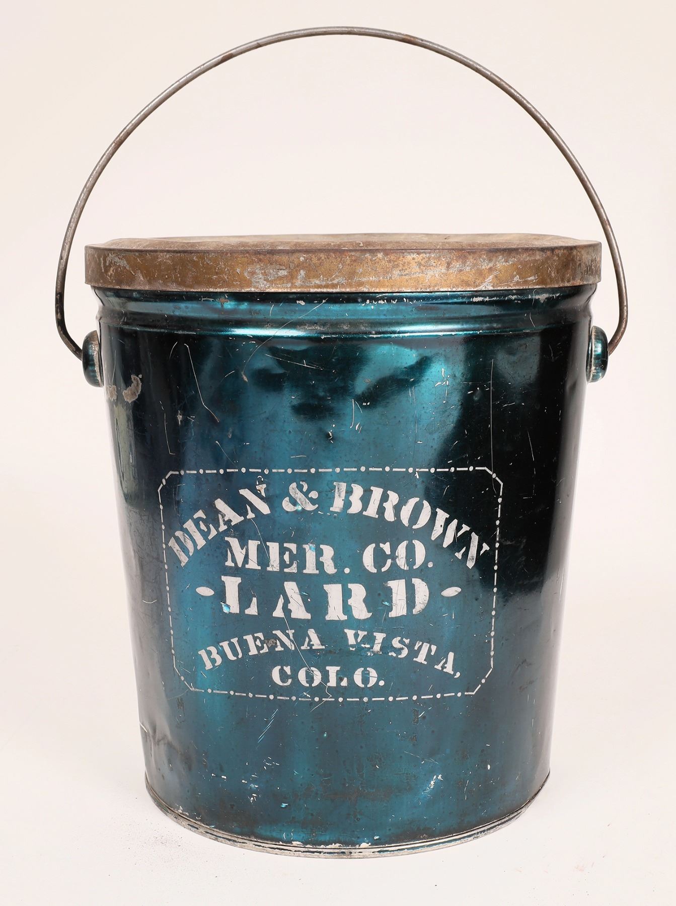Rare blue Dean & Brown Mer. Co./Lard/Buena Vista/Colo. tin with lid. 8x7.5". Some wear to sides and lid. Buena Vista Colorado