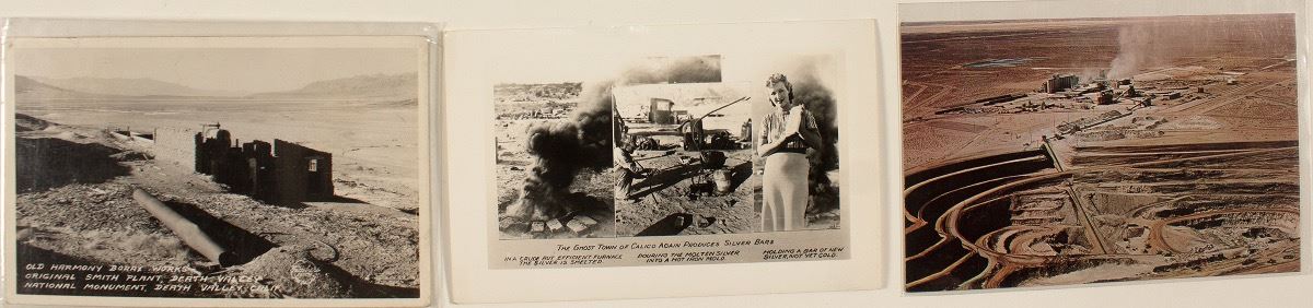 Group of 3 postcards from the Prag collection, including: "Old Harmony Borax Works - Original Smith Plant, Death Valley National Monument, Death Valley, Calif.; The Ghost Town of Calico Again Produces Silver Bars; Aerial View of United States Borax and Chemical Corporation's Open Pit Borax Mine at Boron, Calif. City: Death Valley State: California Date: hwac# 20972