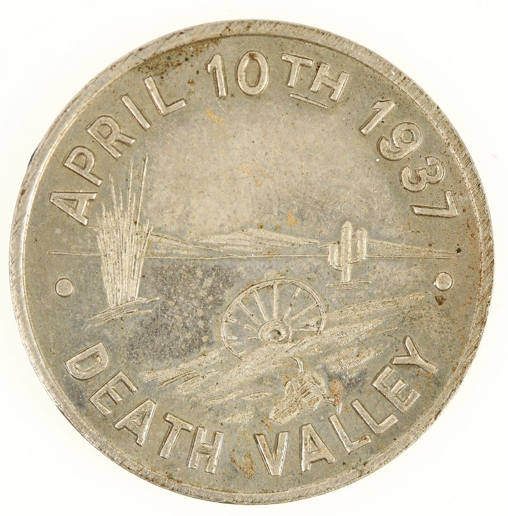 Never seen before by FH. 27mm. White metal. April 10th, 1937 / (wagon wheel and cactus pictorial) / Death Valley // 60th Masonic District / (masonic logo) / California.