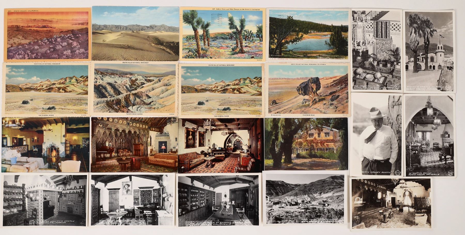 Lot of 24. Nine RPC's, several linen era cards. Post Marks : Yellowstone Park Wy., L.A., Canoga Park Ca. Ground Level view: desert flowers, Joshua trees, interiors of the Furnace Creek Inn, Twenty Mule Canyon, The Funeral Range, Death Valley Scotty of Scotty's Castle, interior and exterior of Scotty's Castle. Distant birdseye of Scotty's Castle. California Death Valley 1924-42 Ken Prag Collection