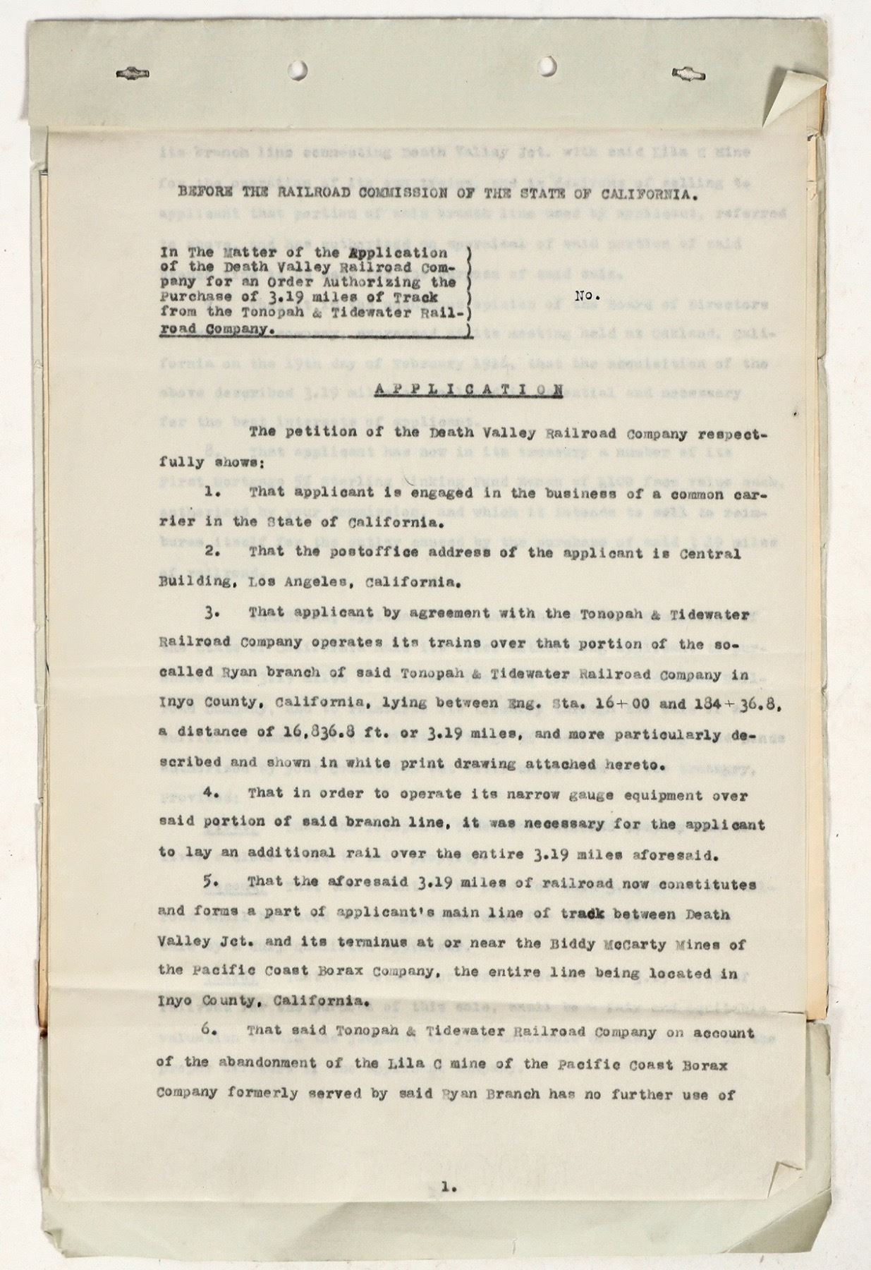 John Ryan signs a 3pp document requesting clearance of a 3.19 mile section of the old Ryan rail line from the Lila C mine to the Death Valley RR Co from the Tonopah & Tidewater RR Co., 1916, with map attached.