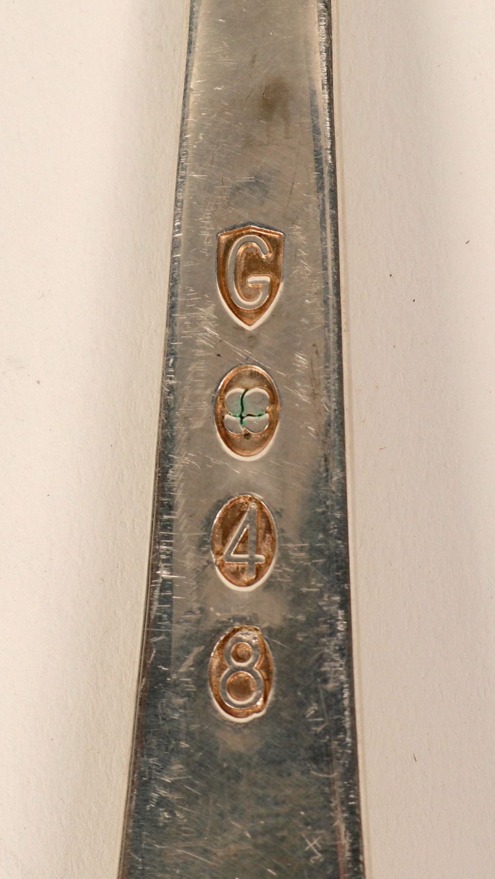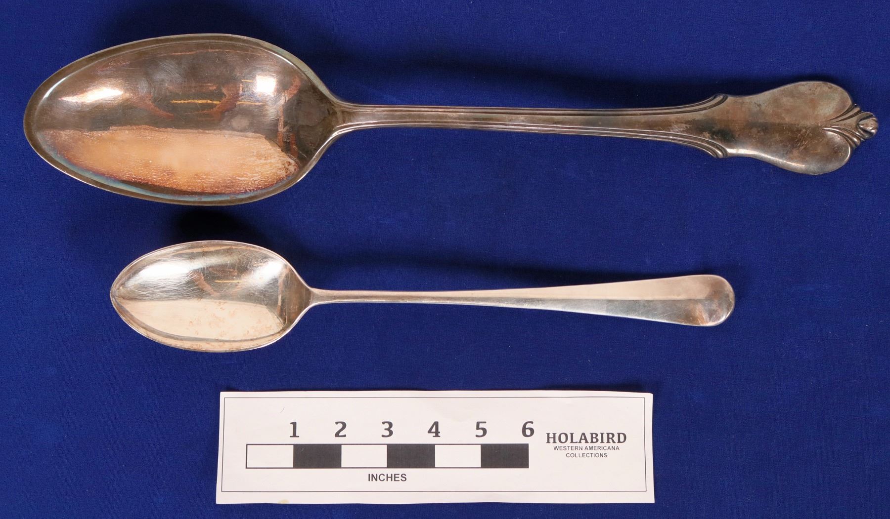 This is a lot of two large serving spoons; the first is a reproduction 1740 Georgian Dressing spoon, 13 in., marked "G, flower, 4, 8". The second spoon is silverplate, maker unknown, at 18 in., size #8. These two should get the job done!