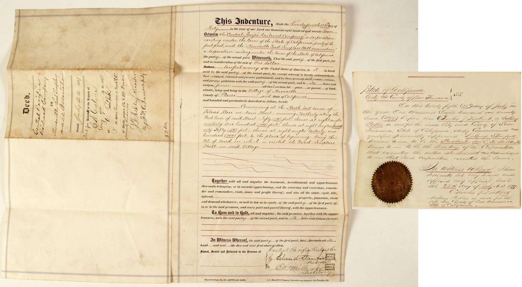 Deed between Central Pacific Railroad to Newcastle Good Templars Hall Assoc., at Auburn Ca.for consideration of $1. Notarized signature of President Central Pacific, Leland Stanford. 8.5" x 14" City: Village of Newcastle State: California Date: 1877 HWAC# 78353