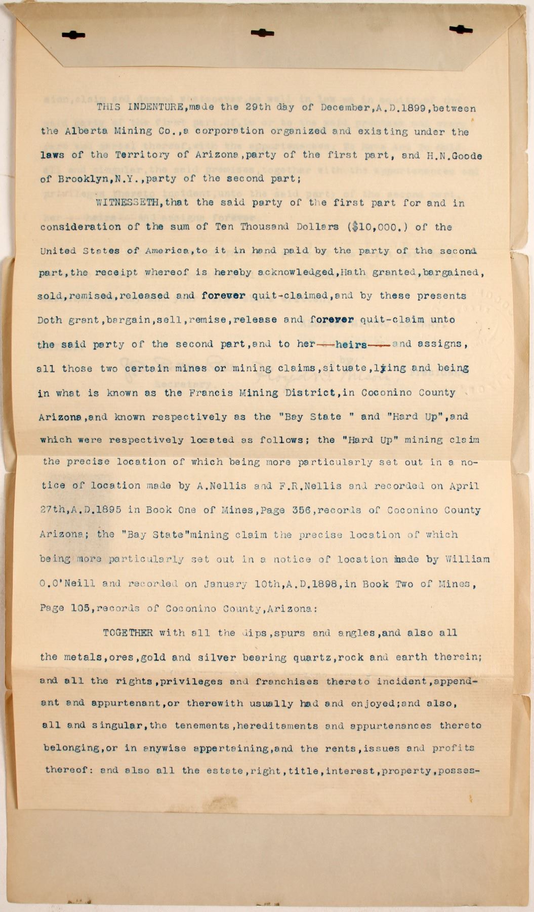 Three page typed deed for this mine, complete with a properly cancelled $10 revenue stamp (R176) and the signatures of the three owners.