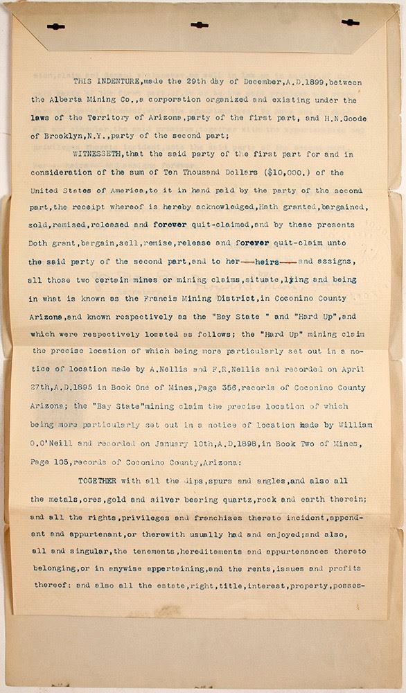 Three page typed deed for this mine, complete with a properly cancelled $10 revenue stamp (R176) and the signatures of the three owners. HWAC# 62936 Date: Location: Francis Mining District, Arizona