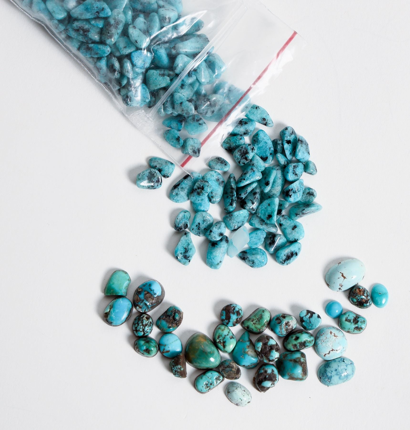 Choice deep blue turquoise nuggets, not drilled plus about 10 g of tiny cabs, many locations. 35 grams overall. a nice group of small polished stones for the professional jeweler. Frank Lewton Coll, 1970s. [] [] [] [] []