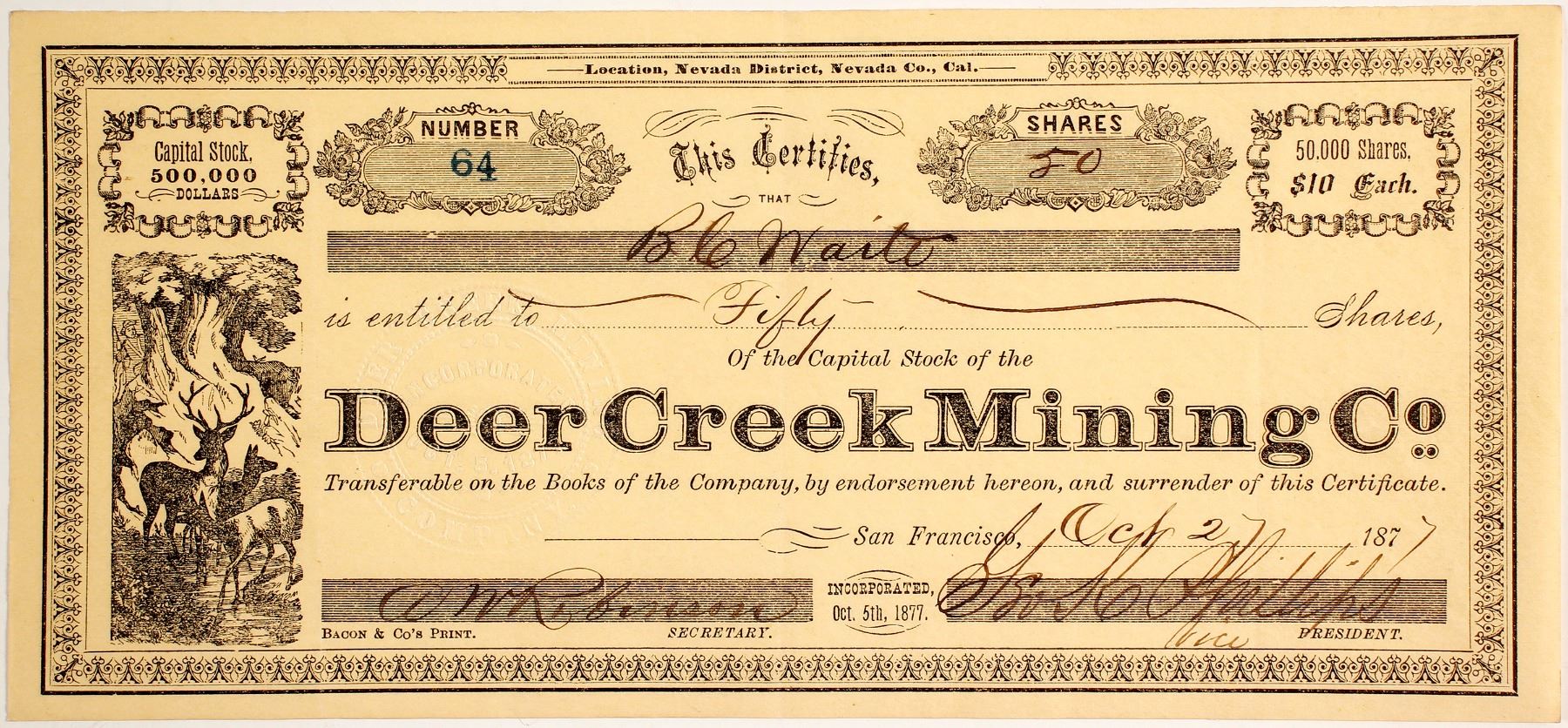 # 64 for 50 shares to BC Waite. Signed by AW Robinson and vice president George K Phillips. Dateline 1877 San Francisco. Incorporated October 5, 1877. Deer vignette. Bacon & Co. printer. Not cancelled. No edge, corner or discoloration issues. Two small pin holes where stamp was applied to heavily. Excellent! Original directors were Augustus Robinson, Phillips, George Cranston, Waite, and Hagadorn. IKn 1881 it was reported they were doing nominal work. This was a placer mining operation that dates back to the early Gold Rush days. "... in early 1850, the discovery of rich gold-bearing gravels led to the establishment of many mining companies, both big and small, hoping to prosper from the glimmering resource. Much of the activity centered on Deer Creek. Hydraulic mines sprang to life and the hills were pockmarked with “coyote holes” – small, crude mines burrowed into the slopes with the dirt and gravel deposited in heaps at the entrances. So common were these mines that Nevada City was jokingly referred to as “Coyoteville” in its formative years. Hope sprang eternal in the hills of Nevada County. But it was the 1850 discovery of rich gold veins in quartz outcroppings that elevated the dreams to fever pitch."[The Union, "Quartz Fever" by Noy] Prag Collection State: California City: Nevada County, Nevada District Date: 1877