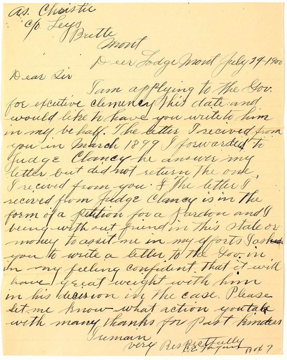 C. E. Fagan(?) is writing his lawyer, A. S. Christie of Butte, asking him to approach Governor of Montana to get clemency. All other means he has tried have been of no use. This is a marvelous letter that needs more research to unfold the whole story! Date: 1900 Location: Deer Lodge, Montana HWAC# 46653