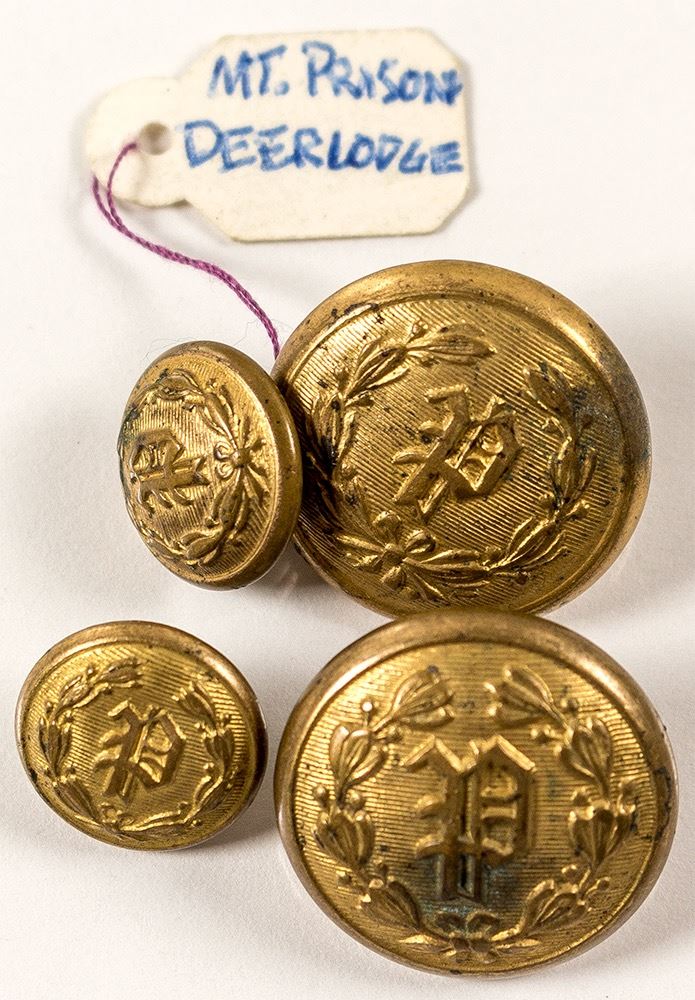 Collection of 4 brass Deer Lodge Prison uniform buttons. Inscribed with a decorative "P" on the face of each button. Two button sizes, small and large, two buttons of each .5" and .875". City: Deer Lodge State: Montana, Date: Inventory# 40818