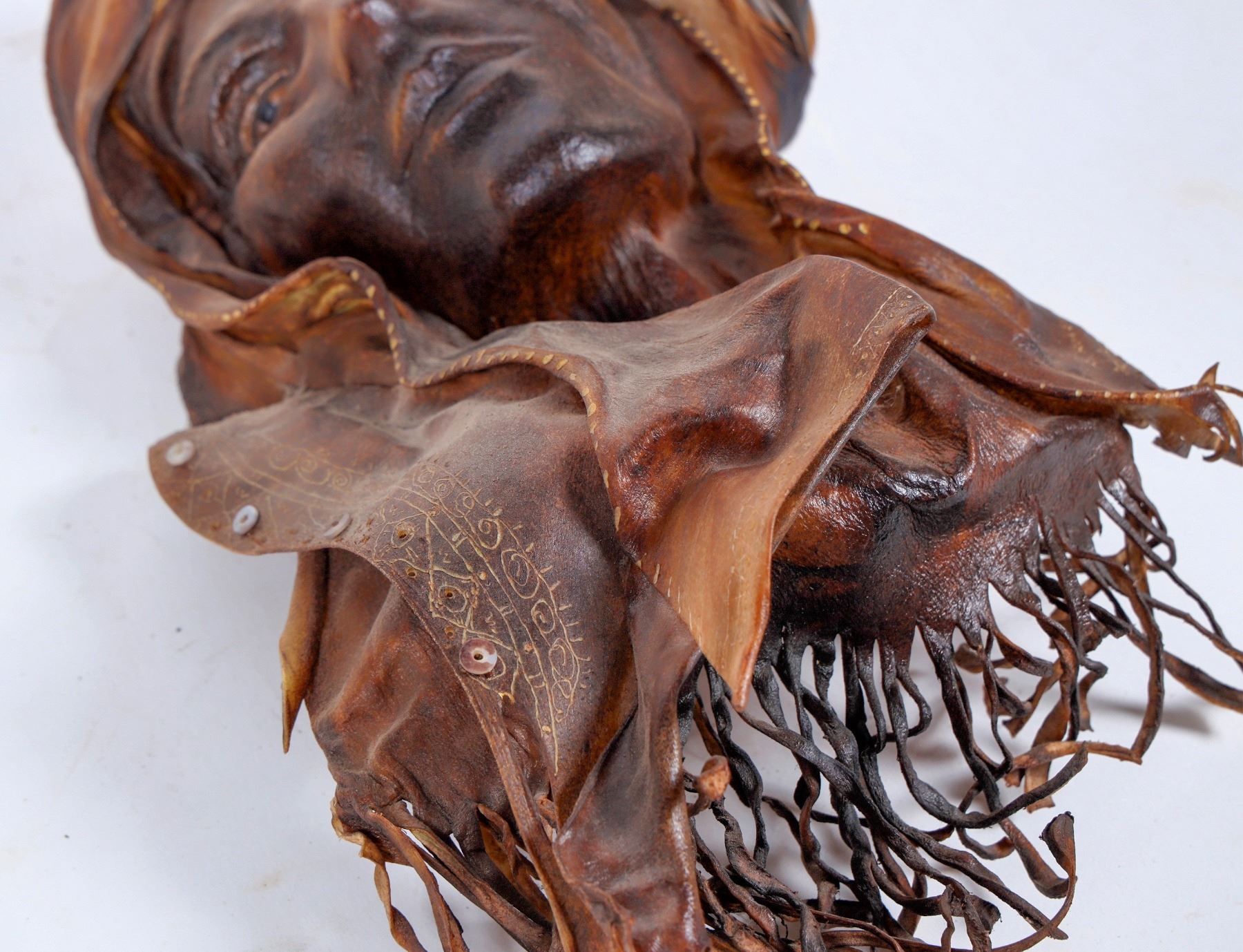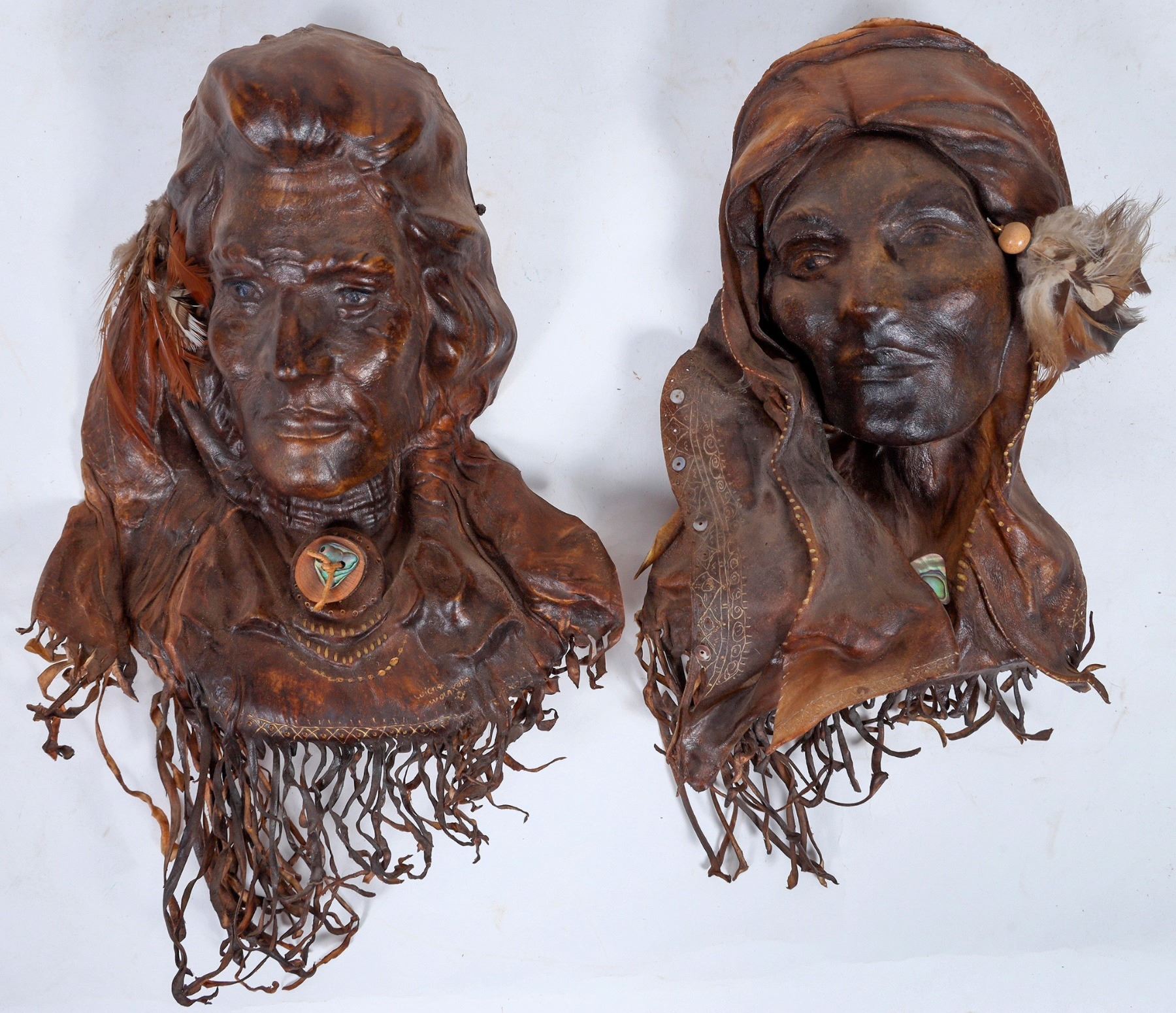 This wall art is made of deerskin. The male is Wicasa Wolakota "man of peace" the female is "Deer Woman". She gives birth to quadruplets to give us the four winds. Made of deerskin, abalone, manzanita, pheasant and Montana stone. Made and signed by R. Raven Sauvage. Please see photo foe details. 14 in. overall length.