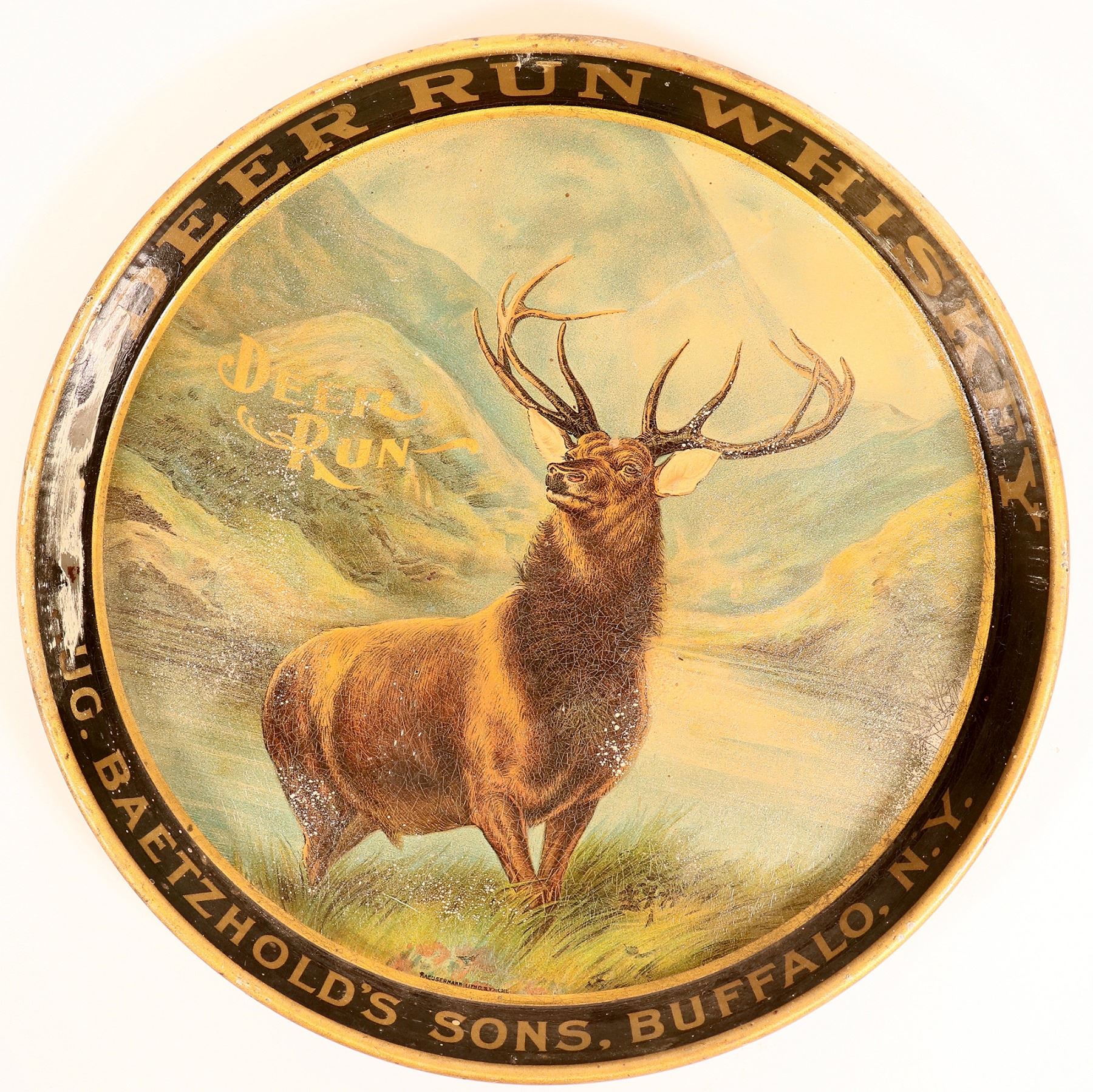 This whiskey shot glass tray is for "Deer Run" at 12 in. with a great sag image on the tray bottom and "Deer Run Whiskey" on the rim "Aug; Baetzhold's Sons. Buffalo. New York". A sanded edge on the inside rim, crazed bottom, condition good. C. 1910-1918. Pre-Pro. Buffalo New York