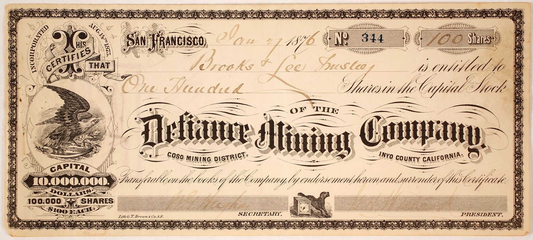 This stock certificate is considered the important for the Coso Mining District. Number 344 for 100 shares to Brooks & Lee trustees. 1876. SIgned by NG Hughes and GH Willard. Names are faded. Folding at corners. PIn holes. One small rip bottom left corner. Overall, good condition. This is a hard to find GT Brown, African American, lithographer out of San Francisco. He designed this stock in 1875. One assessment stamp - paid. Brooks & Lee were stock brokers in San Francisco according to the Pacific Coast MInes Stock Buyer Manual of 1870. The Defiance was the largest and most important mine at Darwin. At one point in the 1870’s through the early 1900’s the company was so large and having so many employees that separate small employee bunk houses were constructed all over the hillside, below the mine, and in the upper part of Darwin.The mine was probably discovered in the 1860’s, during the activity at Coso and Cerro Gordo about 1863. By 1875 the mine was the largest producing mine in Darwin with major mining and milling works. (Laguna Collection)