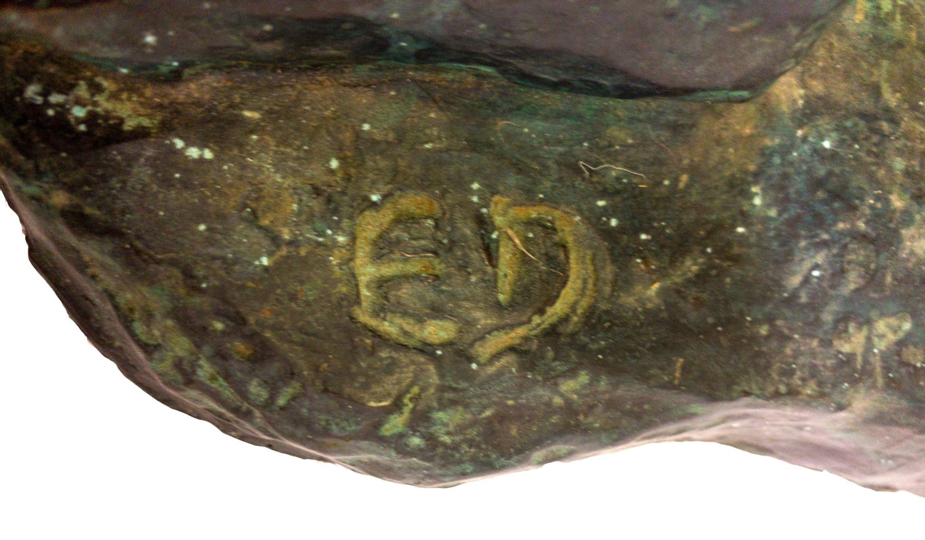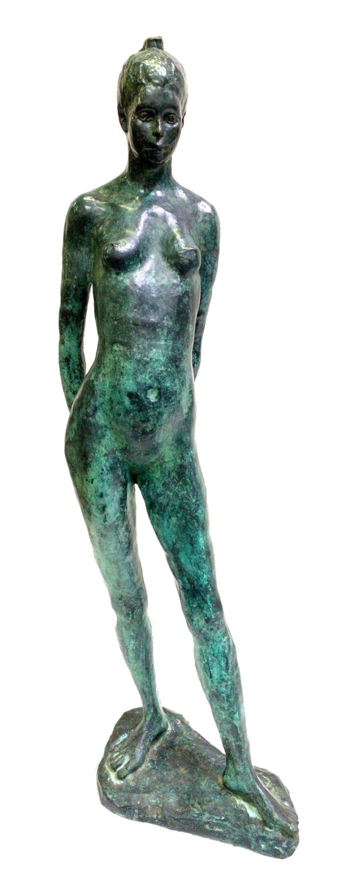 "Study for the Little Dancer of 14 Years". 38" tall bronze with beautiful green patina, signed "ED" at the base adjacent to the cross foot. The Degas series of the Little Dancer are known world-wide. Much is written on the series, nearly all of which were made after his death. Little was found of this specific piece, other than the original held in the Copenhagen Museum, which has a bronze rectangular footing. The bronze is not marked by a foundry, thus is not a Hebrard second state Degas bronze. State: City: Date: HWAC# 84802