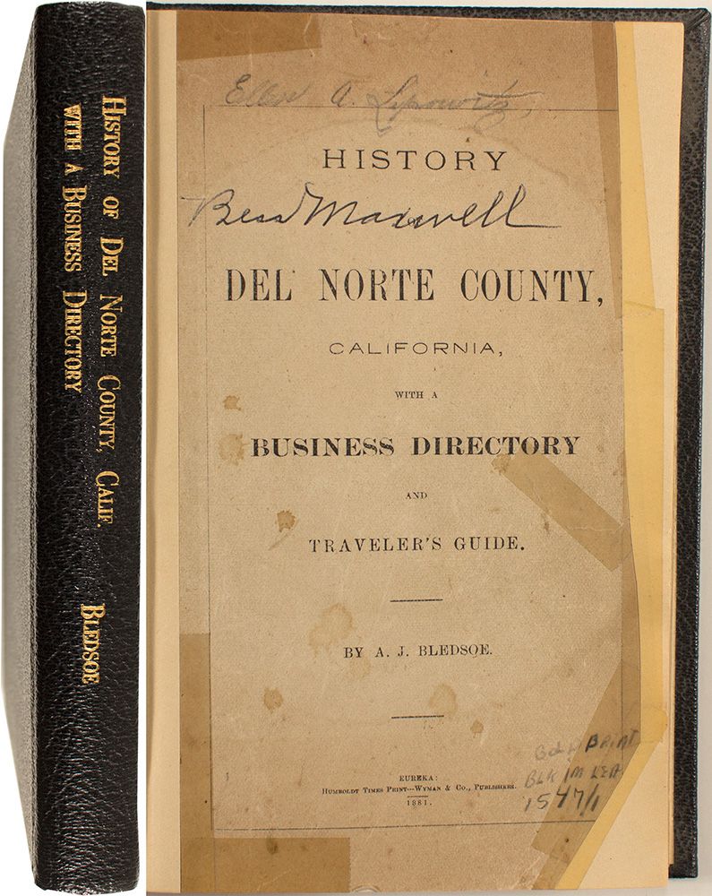 Quebedeaux 10: lists 4 copies known. History Del Norte County, California, with a Business Directory and Traveler's Guide. By A. J. Bledsoe. Humboldt Times Print---Wyman & Co., Publishers, Eureka, 1881. First 174 pages are a very detailed history of the county. Following this is the Traveller's Guide, listing distances from Crescent City to various locations, and then the Business Directory for Del Norte County. Directory is split by city: Crescent City, Del Norte, Happy Camp. Ends with pages of advertisements. Condition: book has been rebound. Title page has been repaired and has former owners' names written in pencil and pen. Tape repairs elsewhere. Majority of pages are bright and clean.City: County: Del NorteState: CADate:
