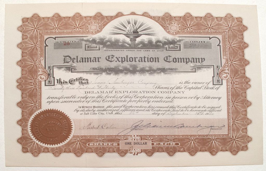 Certificate issued for 2,330 shares in 1940. Inc. in Utah in 1911. Issued to Simon Bamberger Company and signed by Julius Bamberger as president. Mining at Delamar dates to 1892 and Capt. John De Lamar of Montana purchased the principal claims in 1893 which lead to the founding of the camp. From 1895-1900, Delamar produced over half of NevadaÍs output as the rest of the state was generally inactive. De Lamar sold his mines in 1902, after producing $8.5 million in gold. Simon Bamberger was the leader of the new owners (Paher). According to Paher, major mining ceased in 1909, except for a revival between 1929 and 1934. ItÍs interesting to note that this certificate was issued for 23% interest in the company to the Simon Bamberger Company. Nearly 40 years after purchasing De LamarÍs interest, Bamberger was still involved at Delamar. The certificate is in excellent, Uncancelled condition. Date 1940 Delamar, NV hwac 8746