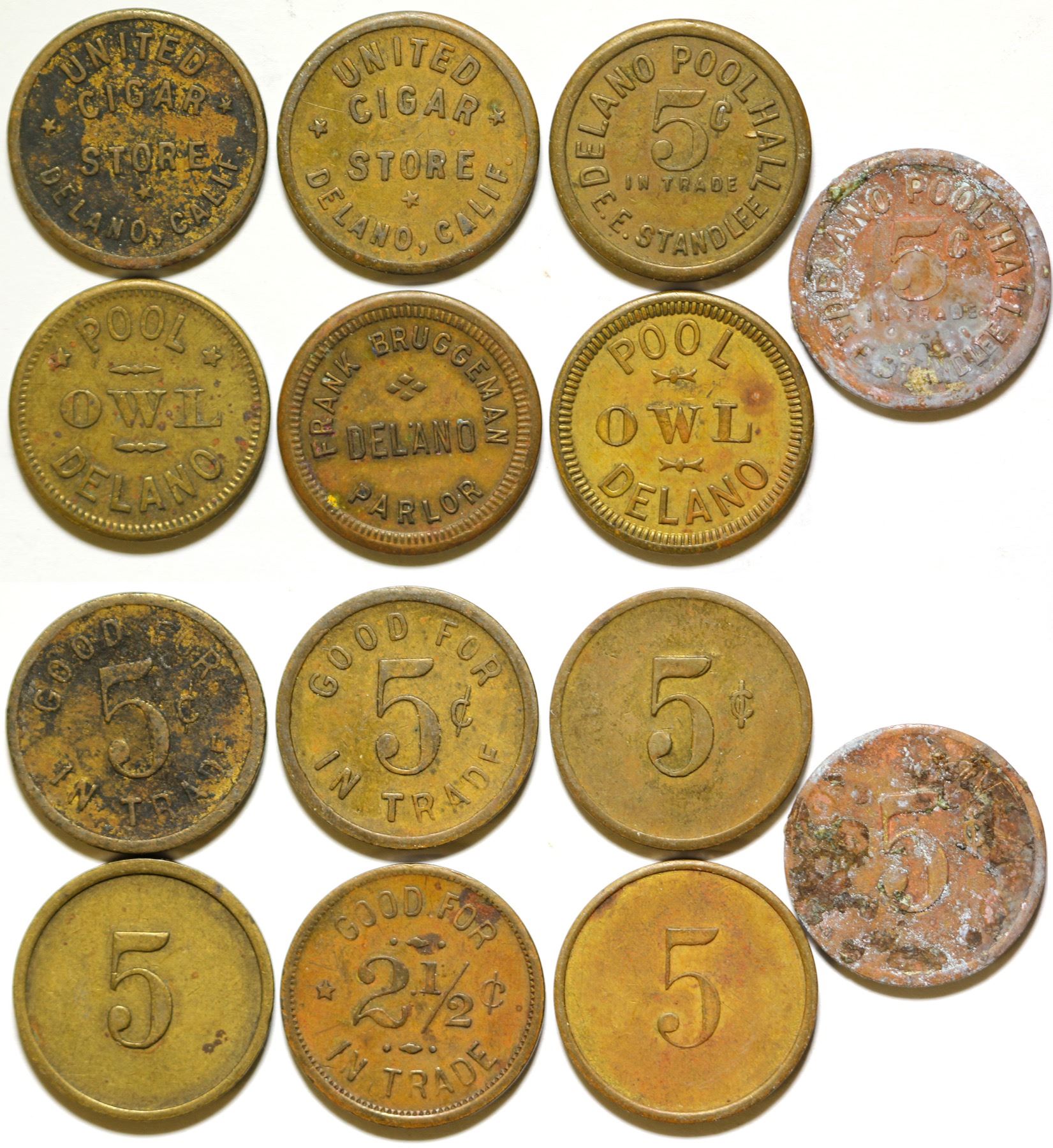 Lot of seven tokens: four different, three duplicates. Owl Pool; Frank Bruggeman; Delano Pool Hall; United Cigar Store. Daniel Manassillian Collection. State: California City: Delano Date: HWAC# 84362