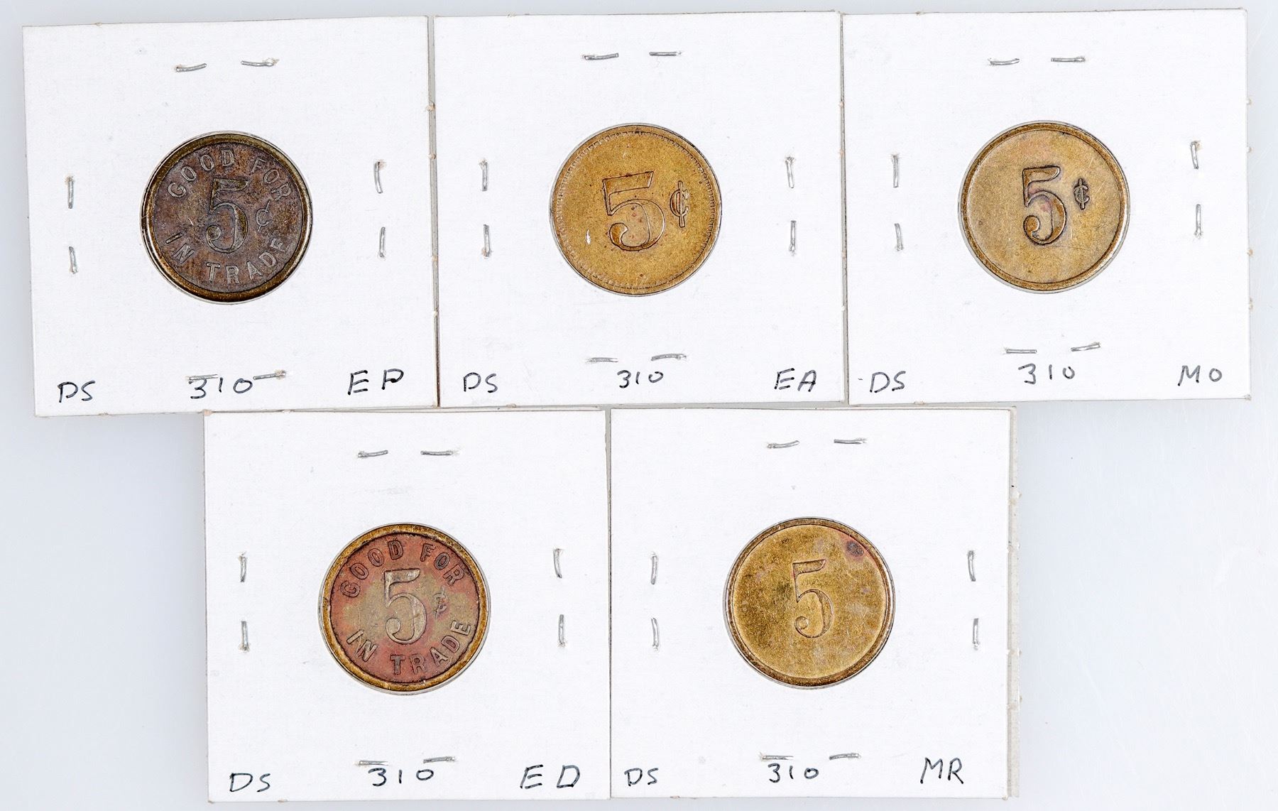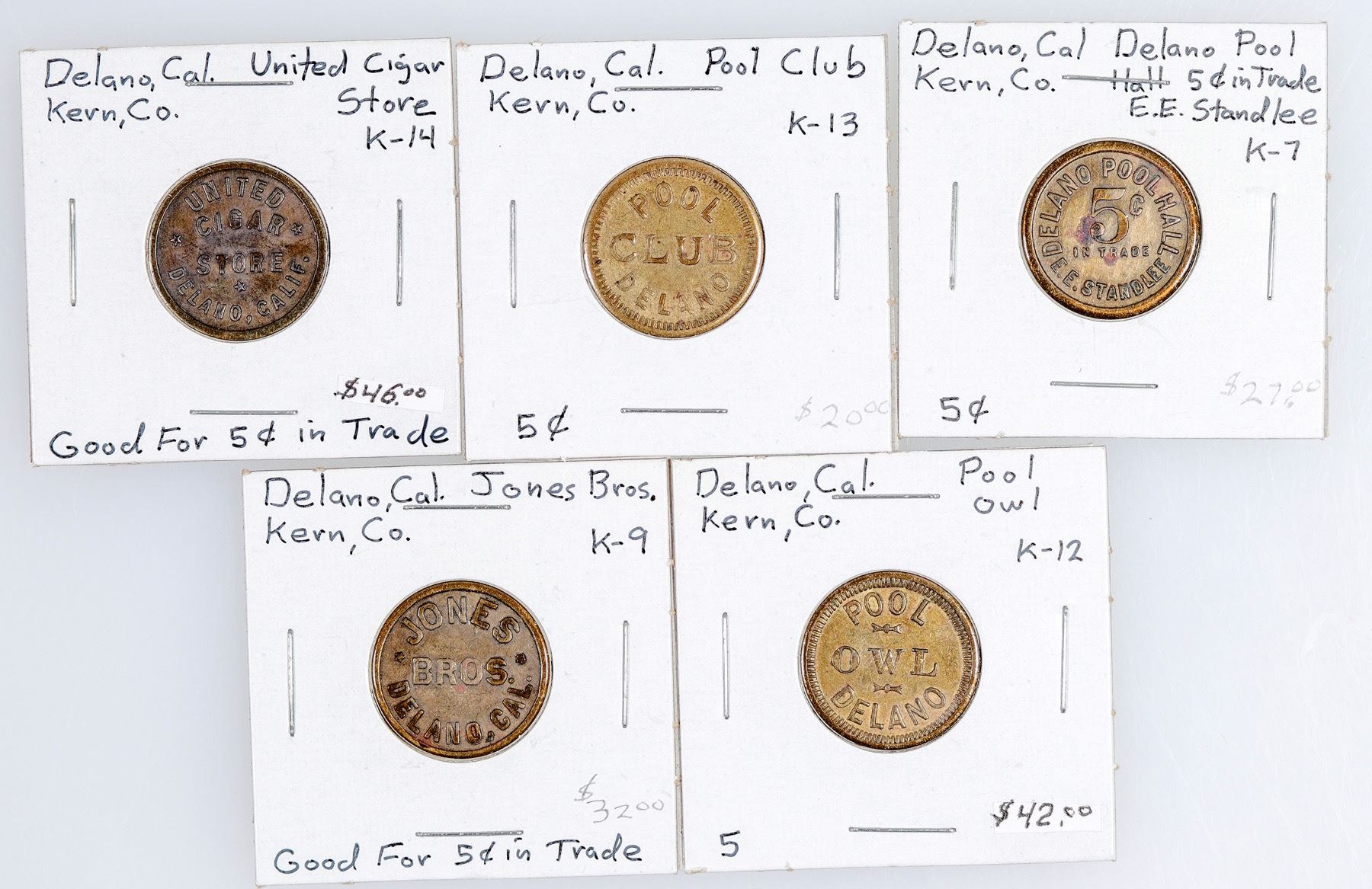 5 Delano tokens. United Cigar, Pool Club, Delano Pool, Jones Bros., Pool Owl. Delano California