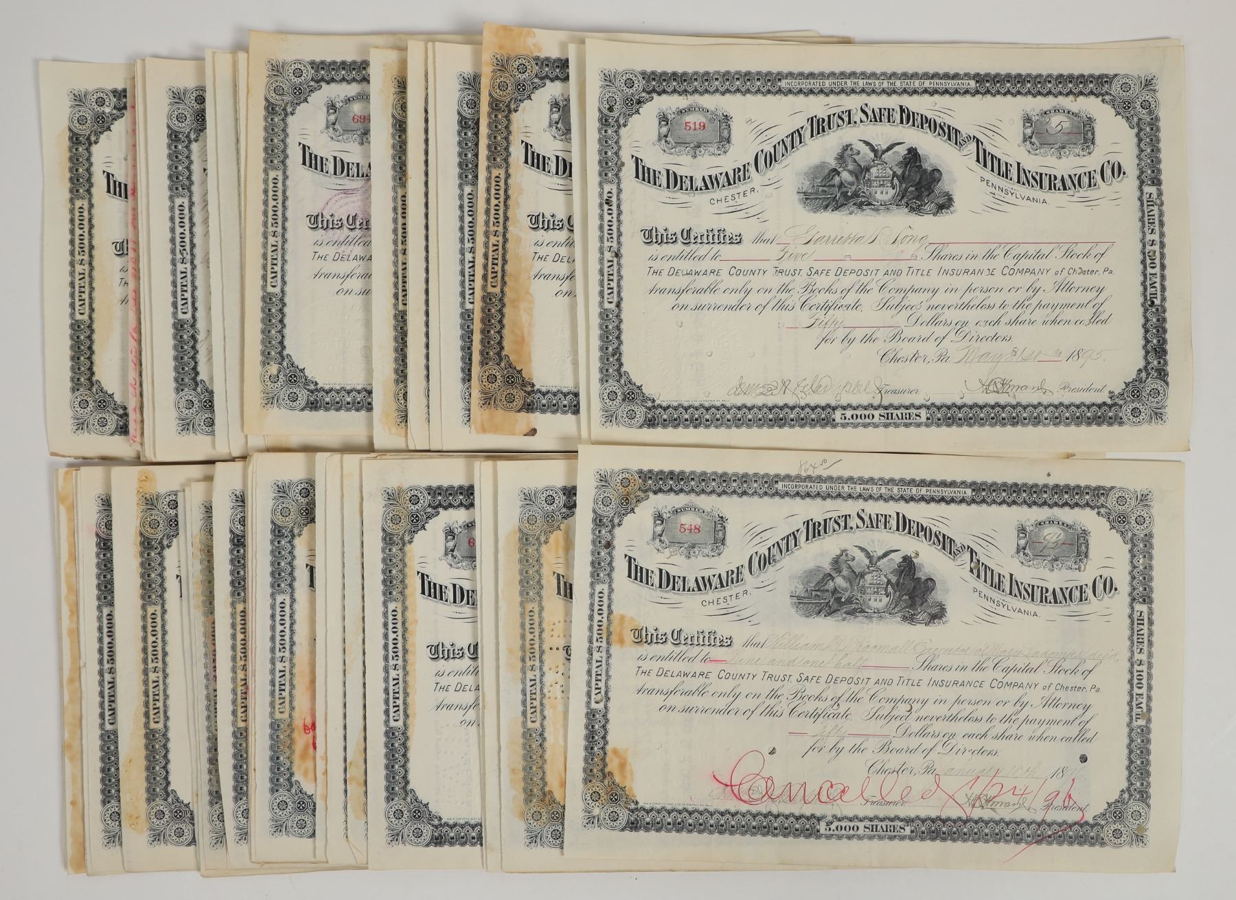 c.1889-1896 Delaware County Trust, Safe Deposit and Title Insurance Co. Stocks. About 75 issued, cancelled stocks, c.1889-1896. Revenue stamps on reverse of several of these historic stocks. See photos.