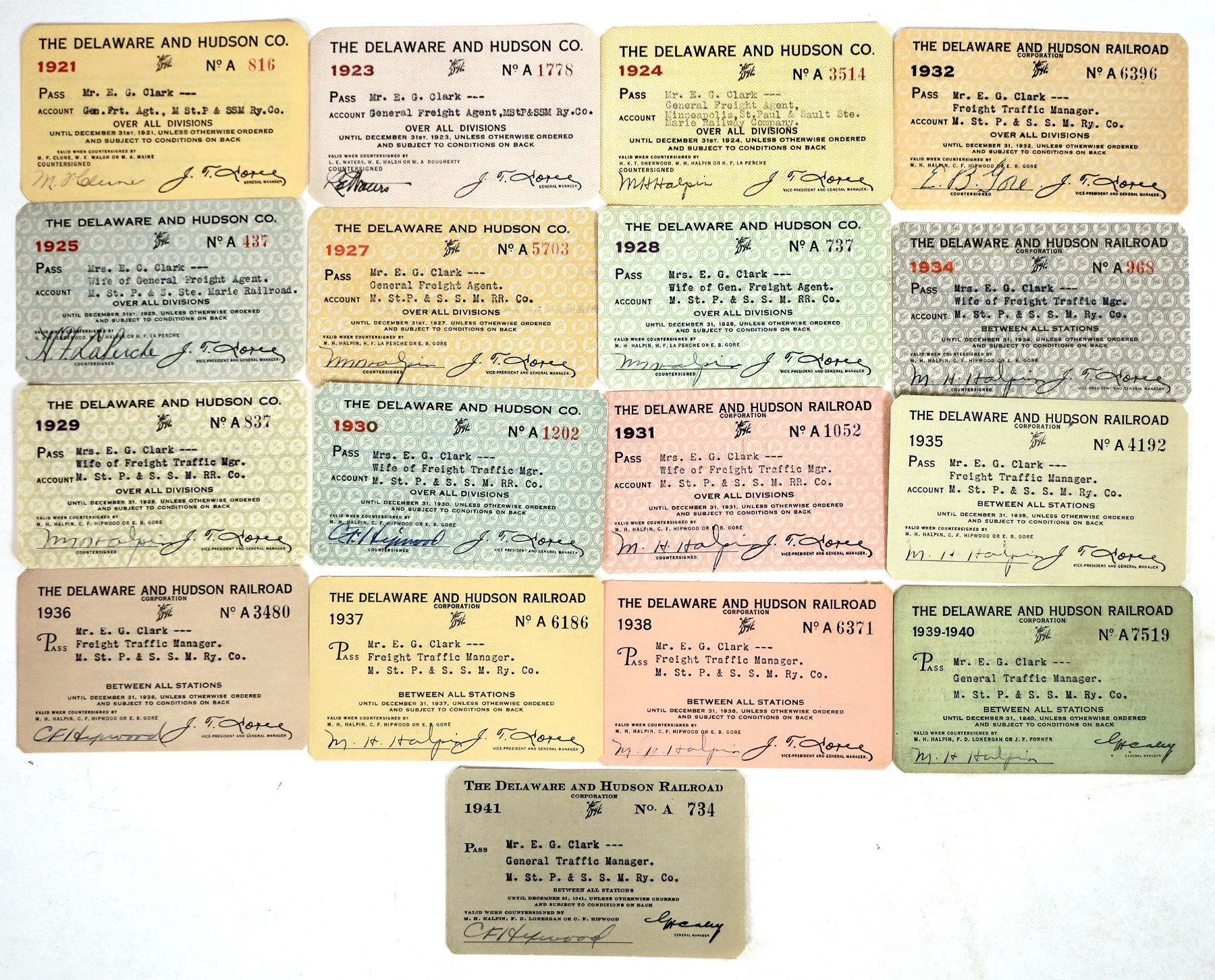 Group of 17 railroad passes from the Delaware & Hudson Railroad Company. Passes date from the early 1900s; see photos for specific years and additional detail.