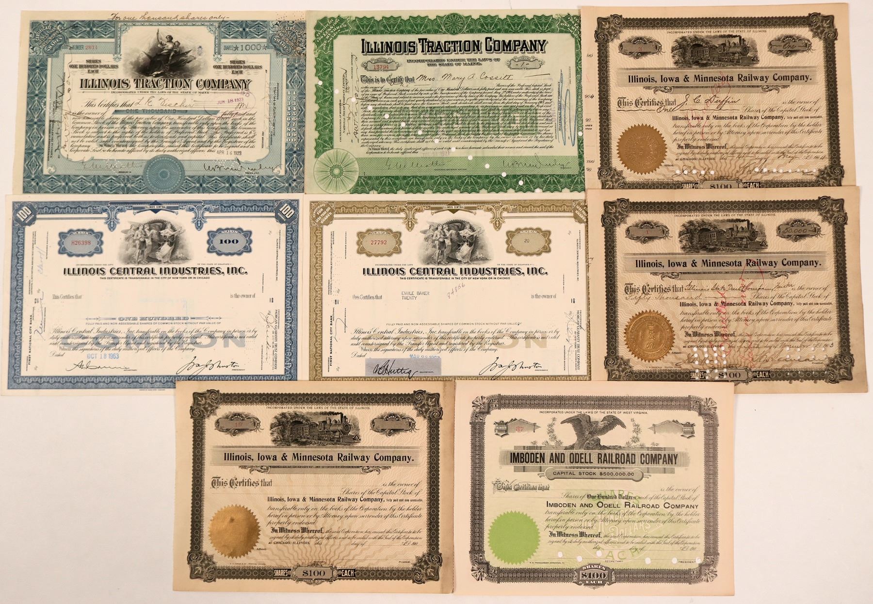 Eight certificates. 1. Imboden and Odell Railroad Co. incorp. 1903 state of West Virginia, operated until 1905 changed to Kanawha and West Virginia Railroad. #37, U/C, $100 par, dateline 190_, Black, vignette top eagle kook l-r wings spread, green seal, "SHARES ONE HUNDRED DOLLARS EACH" encircled green underprint, "100" in small circle around entire border. R.E. Pendergast printer. AU.
