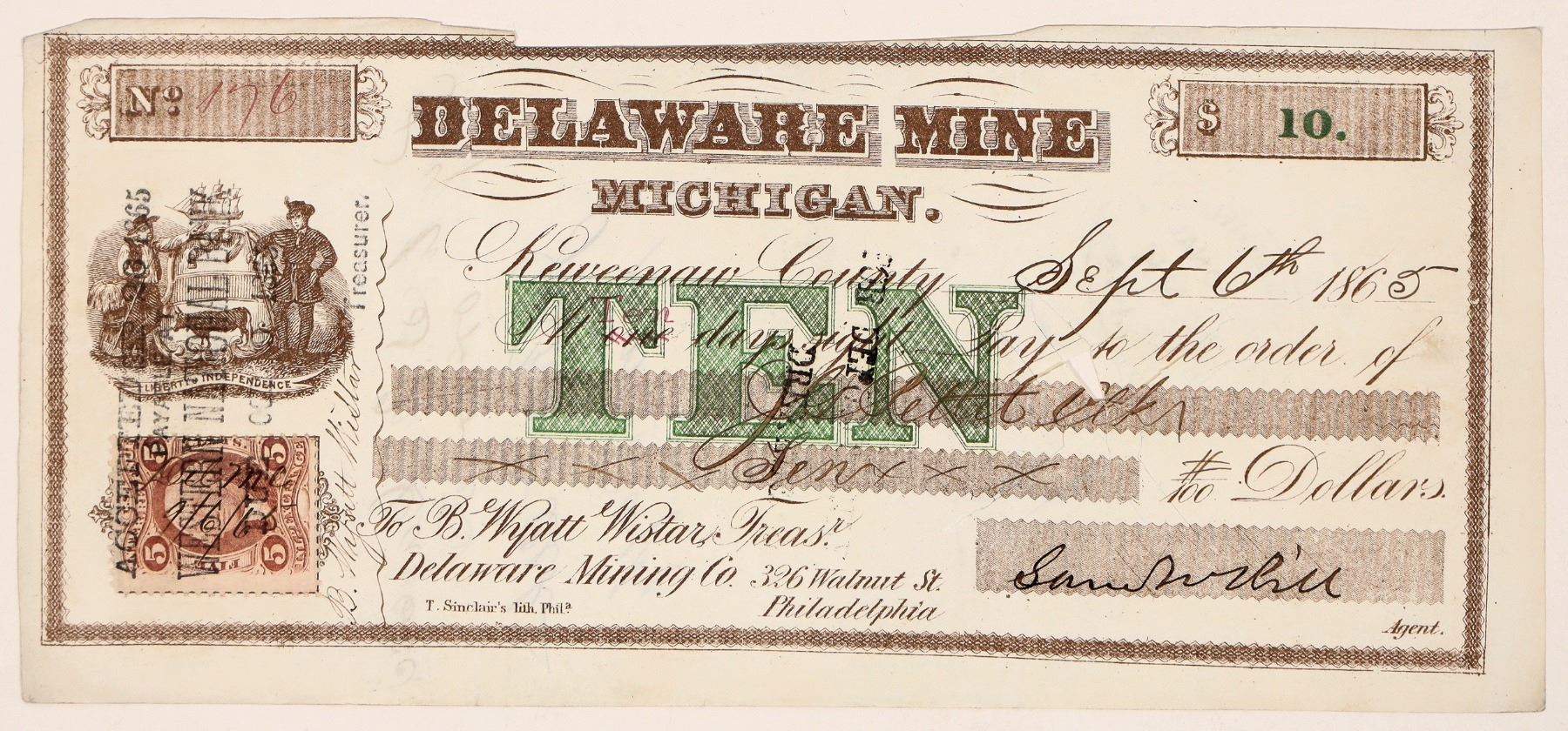 Dated September 6th, 1865. Vignette of Liberty and Independence at left, 5 cent adhesive revenue stamp lower left. $10 note from the Delaware Mining Co. 326 Walnut St. Philadelphia. Top edge cut.