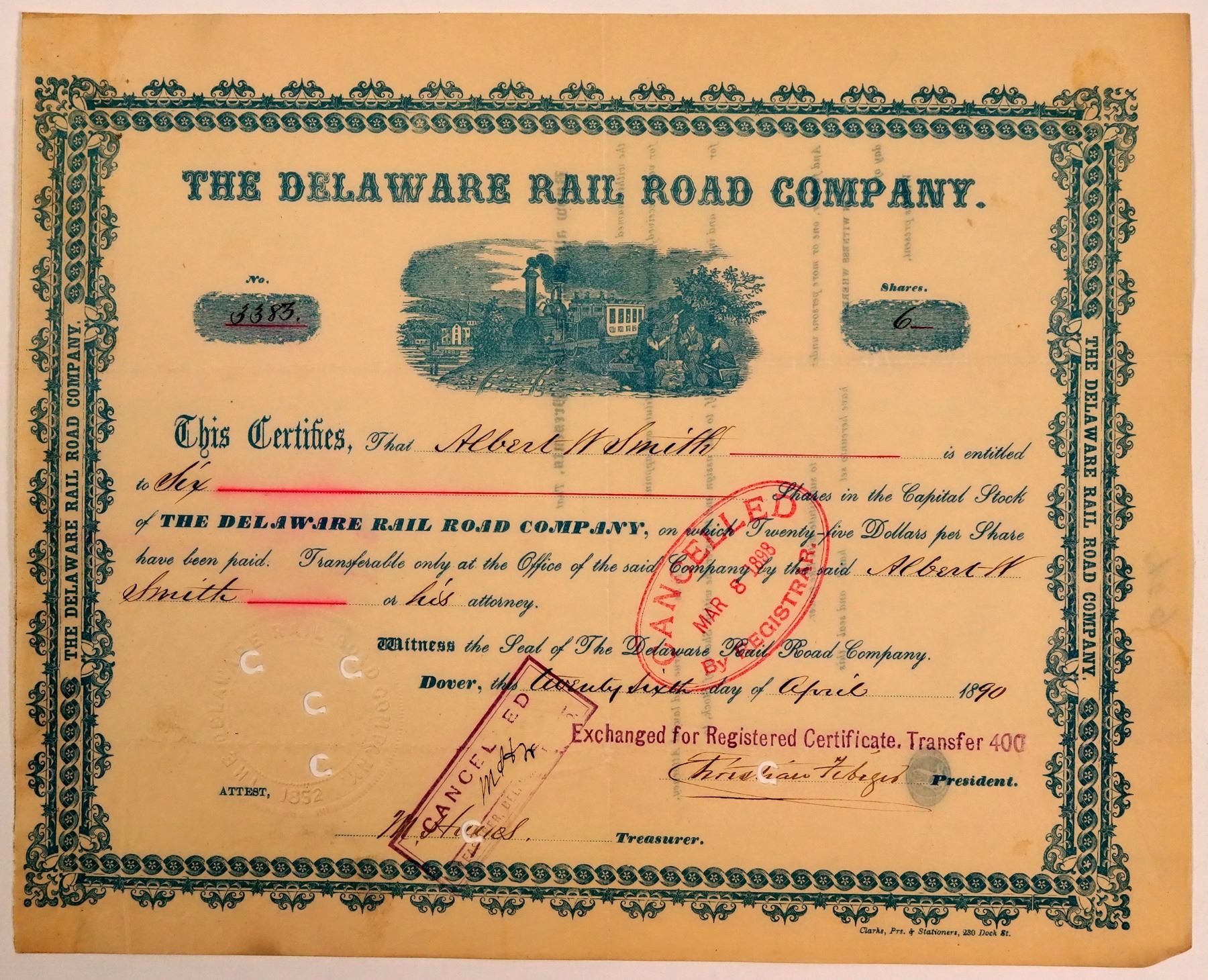Variety not listed in Cox. Corporate seal is stamped 1852 for the year of incorporation. Issued for 6 shares in 1890. Stamp and hole cxled. Exchanged for registered certificate. Nice example of this piece. VF.