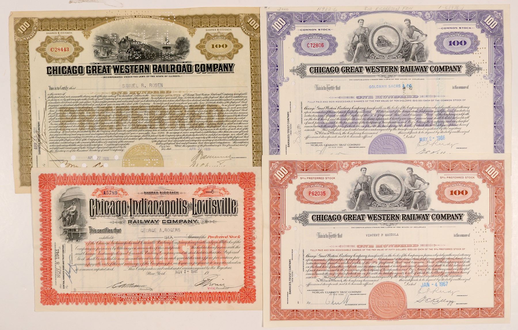 2. Two, Chicago Great Western Railway Co incorp. 1892, operated until 1909. I/C, 100 shares, vignette 4-6-4 loco r-l w/ allegorical figures either side, printed seal, Columbian Bank Note Co: one RED, PREFERRED red underprint, issued Jan 4, 1967. One PURPLE, COMMON purple underprint, issued May 2, 1966.