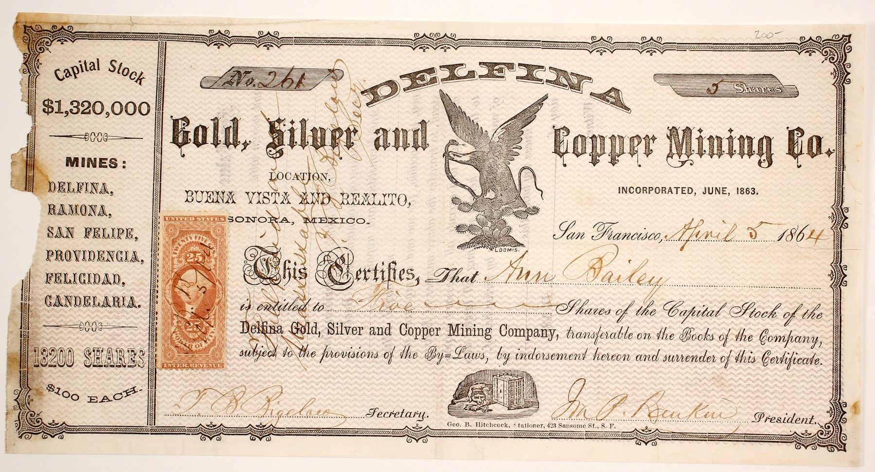 Location: Buena Vista and Realito, Sonora, Mexico. Issued #261 An Baily 5 shares 1864, signed by President Rankin. Left side damage. Mines listed on the left: Delfina, Ramona, San Felipe, Providencia, Candelaria, and Felicidad.
