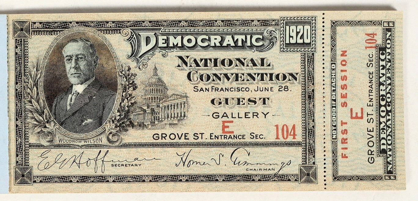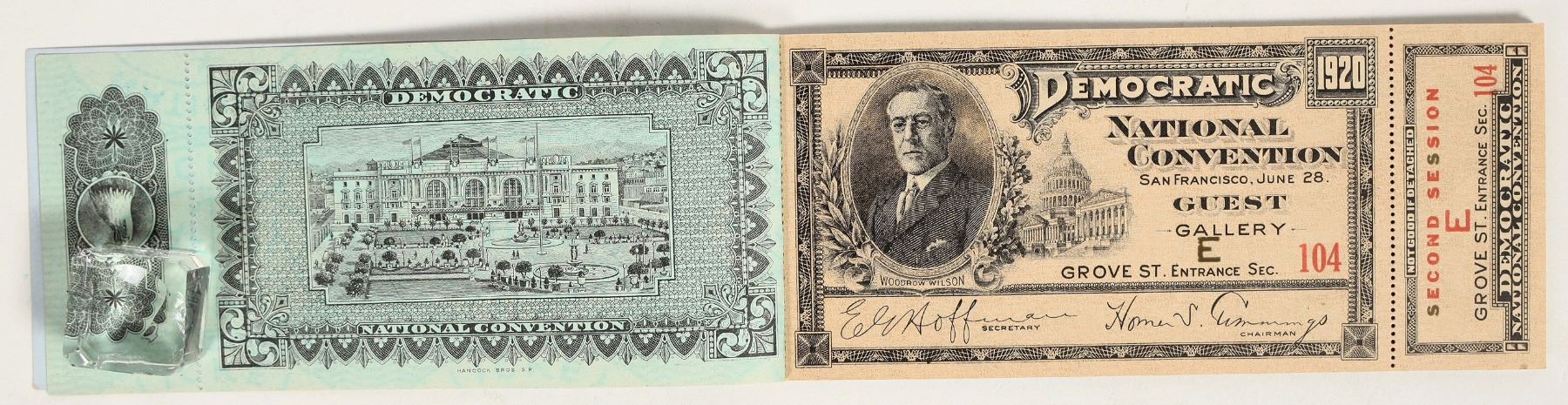 1920 Democratic National Conference in San Francisco ticket book, never used. In excellent cond. This rare and has not been seen by Holabird before.