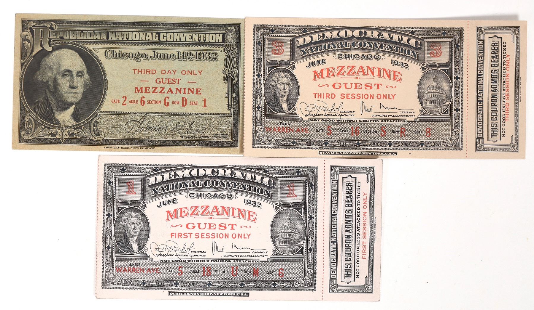 Three admission tickets for the 1932 National Conventions: Republican National Convention Chicago July 14th, third day only; green with Washington vignette. Two Democratic National Convention June, one first session one third session. Tan color, Jefferson vignette. Incumbent president Herbert Hoover lost the election to Franklin Delano Roosevelt.
