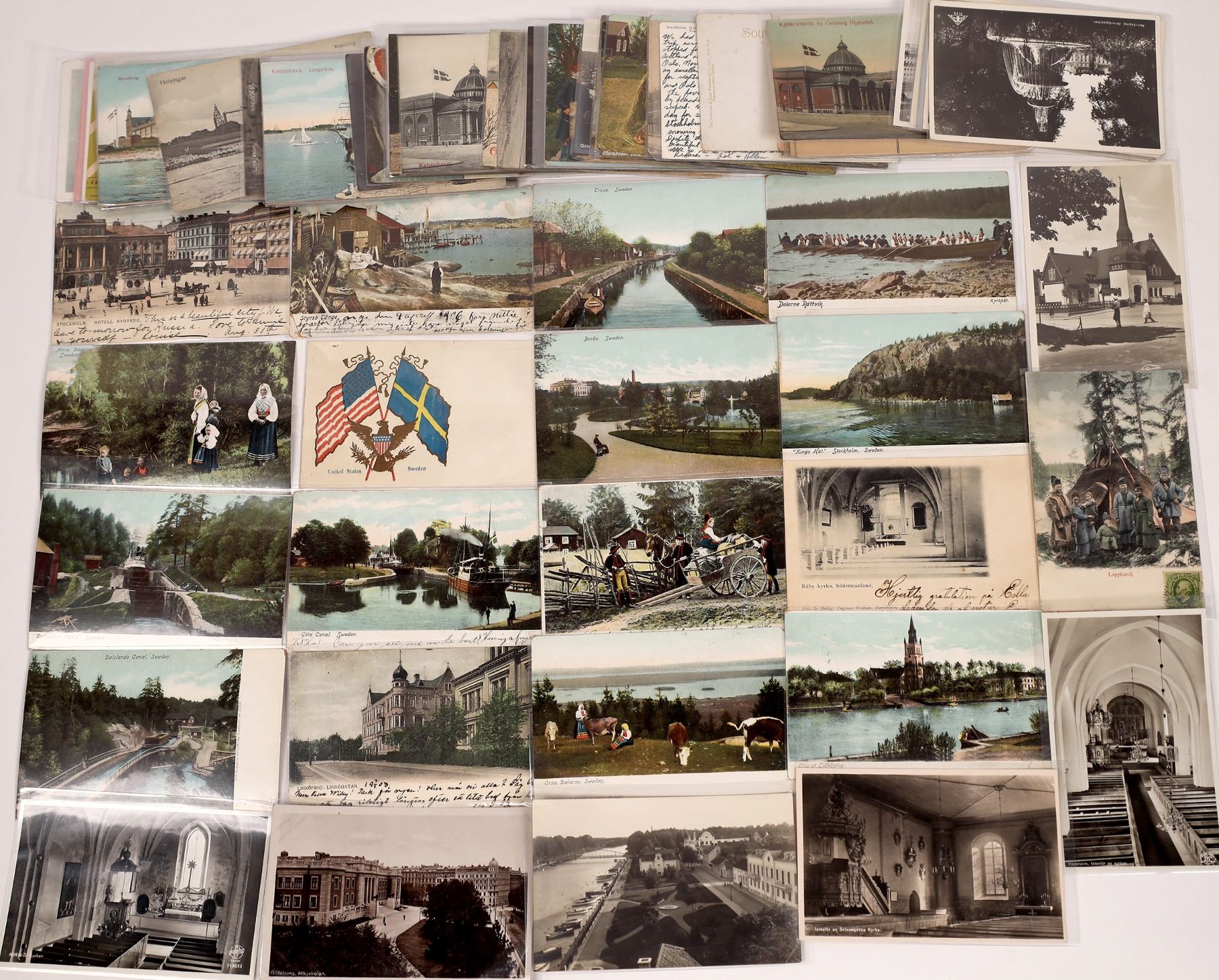 Lot of approx. 90 postcards from Sweden and Denmark. 19 undivided backs, postmarks 1902 - 1909. Approx. 70 split -backs including several white border RPCs, c. 1912 - 1950s. Scenes of buildings including some interiors, street scenes, canals, countryside, gatherings. State: City: Date: Provenance: Ken Prag Collection