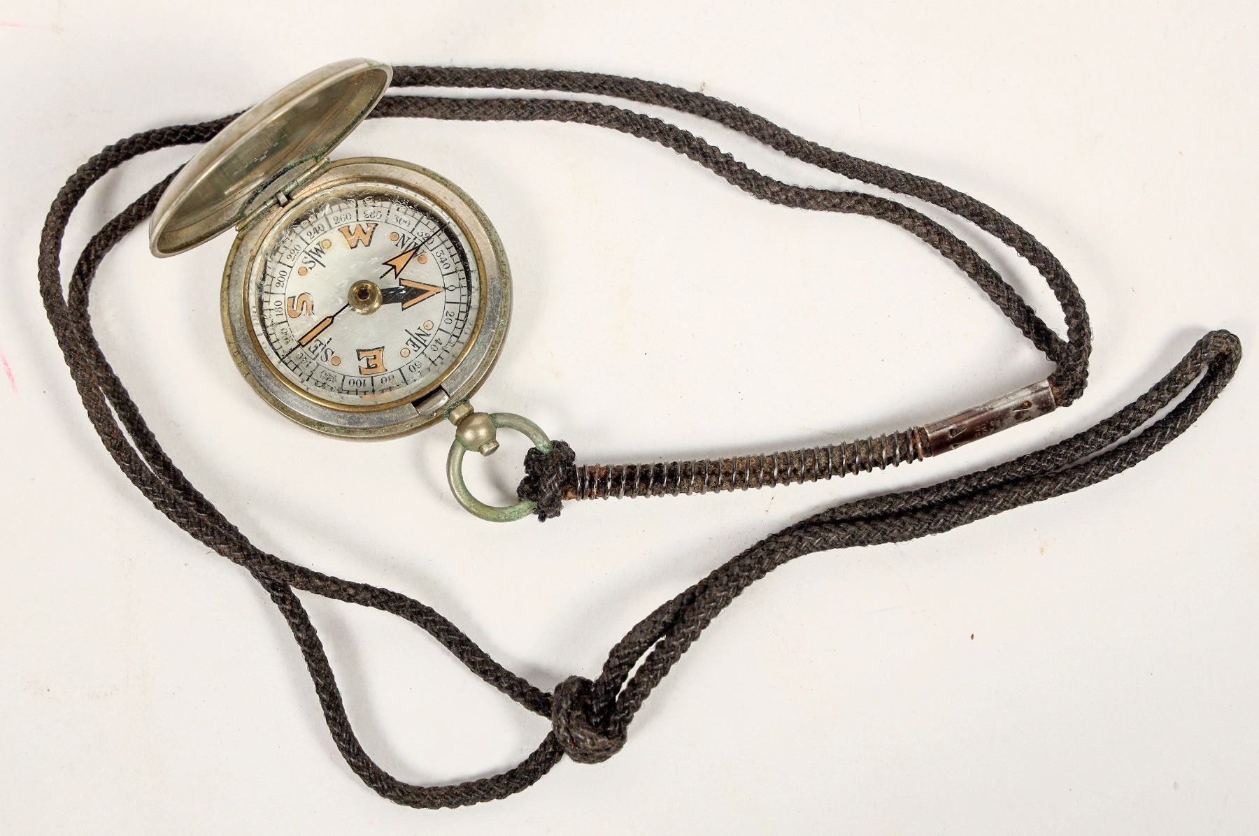 This is a Dennison Compass marked on the cover "Dennison/Birmingham/ VI/ 45778/ 1917". Also marked with the arrow point of the British Crown. Inside the cover is "151397/ M". The crystal has a cloudy edge, slow movement. Light crease dent on the cover. With lanyard. Please see photo for details.