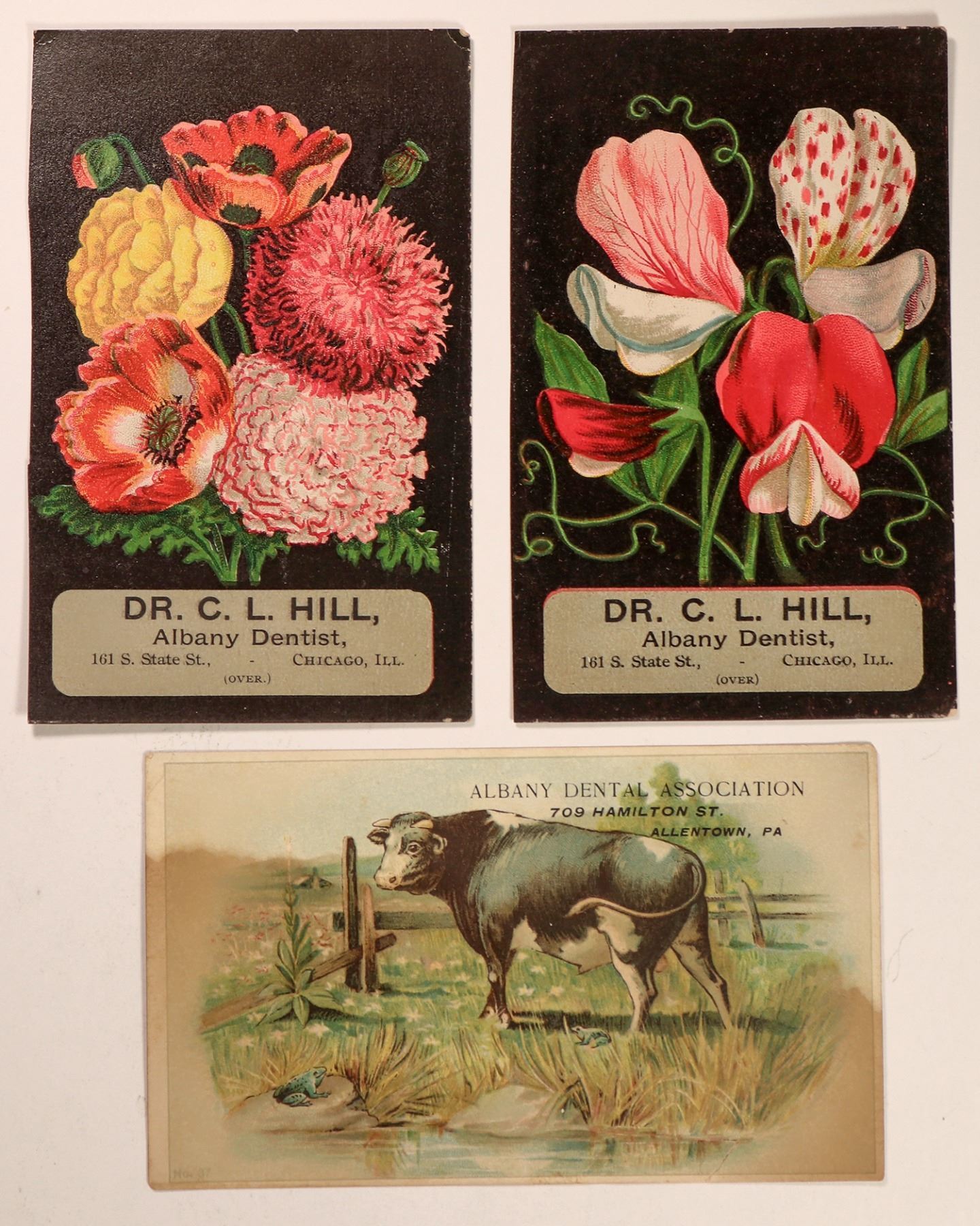 Trade cards measuring 3"x 5" advertising the Albany Dental Association of Chicago, Illinois and Dr. C.L. Hill. There are floral designs on two of them and a bull on the third, which gives an Allentown, Pa. location, which is a bit stained. Unique and in decent condition. Please see photos for more details.