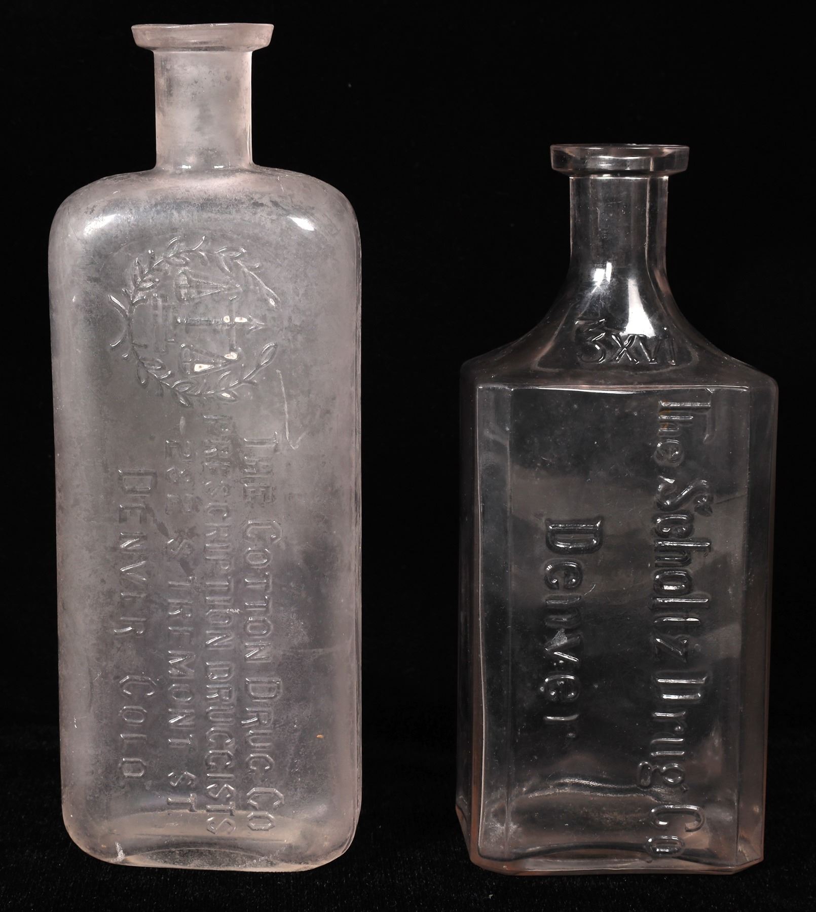 2 Denver embossed 16oz drug bottles. The Cotton Drug Co. The Scholtz Drug Co. No apparent chips or cracks. Denver Colorado