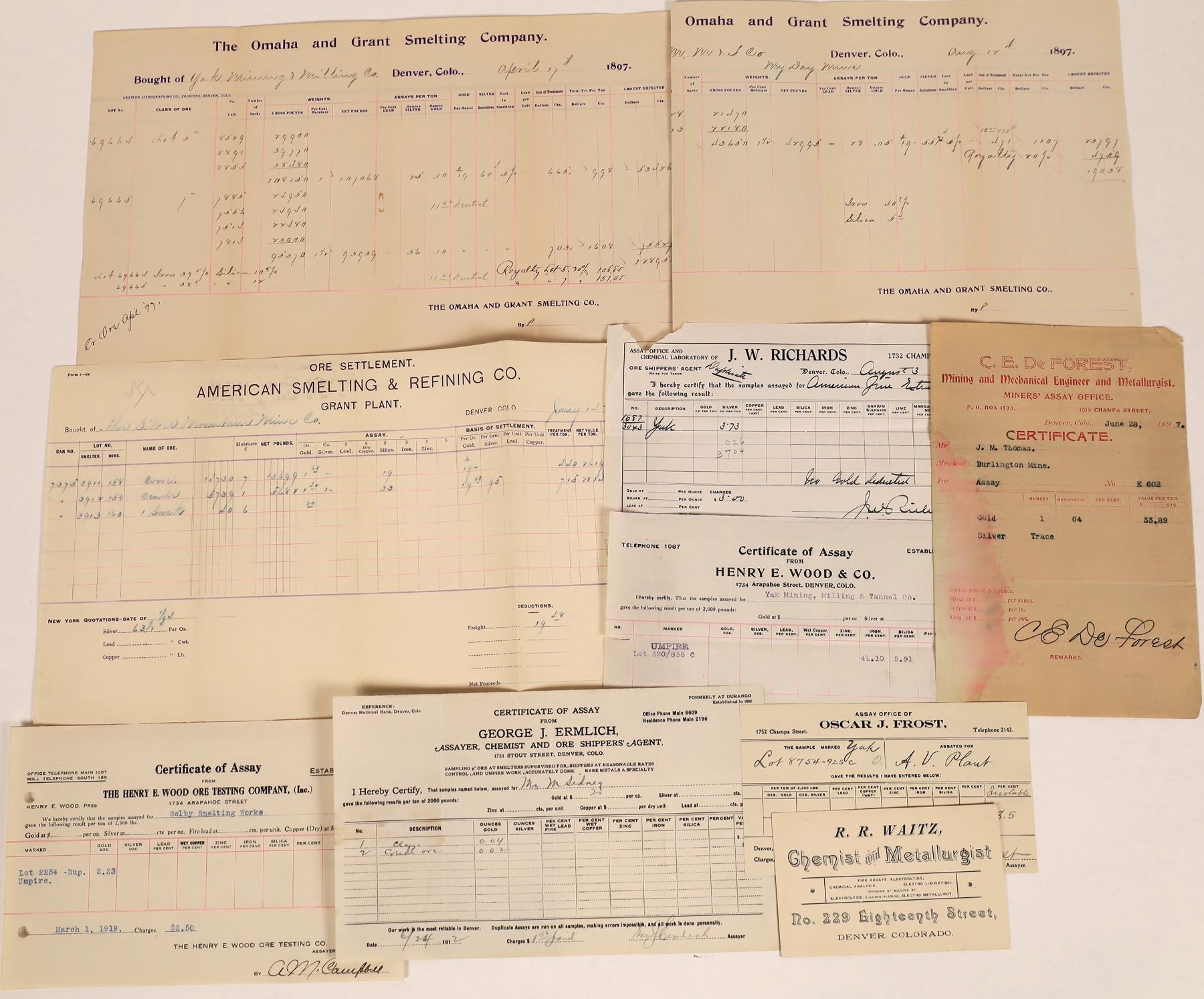 Lot of 11. 1) A particularly excellent business card for R. R. Waitz, fire assays, electro-lixiviation, chemical analysis, etc. 2) Omaha Grant and Smelting To Yak M&M. For iron. 3) Omaha and Grant Smelting Company. To Yak M&M for iron. 4) 1912 George J. Ermlich. For clay and crude ore. Billhead. 5) American Smelting & Refining. For gold & silver. 6) Henry E Wood certificate of assay. To Yak M&M. For iron. 7) Oscar J Frost assay for AV Plant of the Yak M&M Co. 0.86% copper. 8) J. W. Richards 1910. For the Yak M&M Co. for silver. 9) Henry E Wood Ore Testing Company. 1919. to the Selby Smelting Works. For gold. 11) C. E. DeForest mining and Mechanical engineer and metallurgist billhead. For assay for the Burlington mine. 1 ounce gold and a trace of silver. Denver Colorado 1897-1919