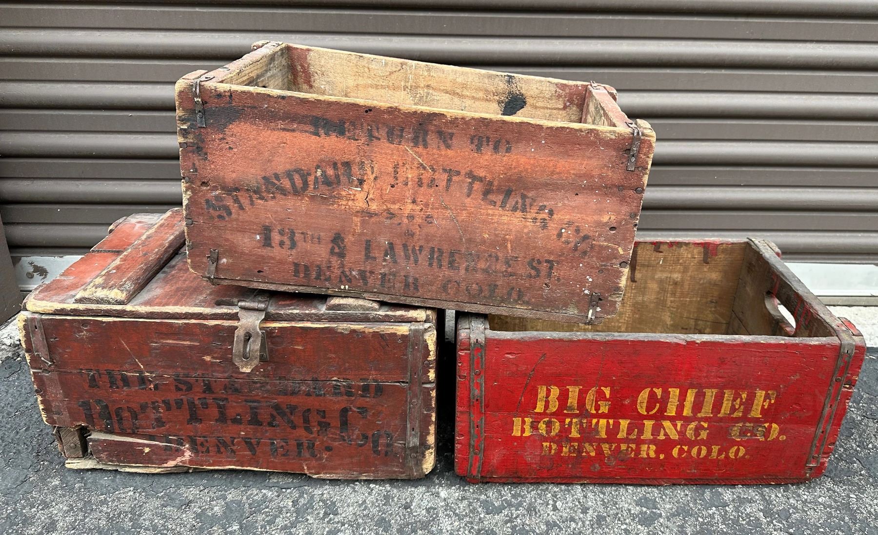 Four vintage wood boxes for beer/soda bottles, all from Denver, c 1890-1915. Merchants: Standard Bottling; Big Chief; The Standard Bottling; Zang Beverage. Bracken Collection. All these merchants had embossed bottles (except maybe Big Chief) Colorado Dnver