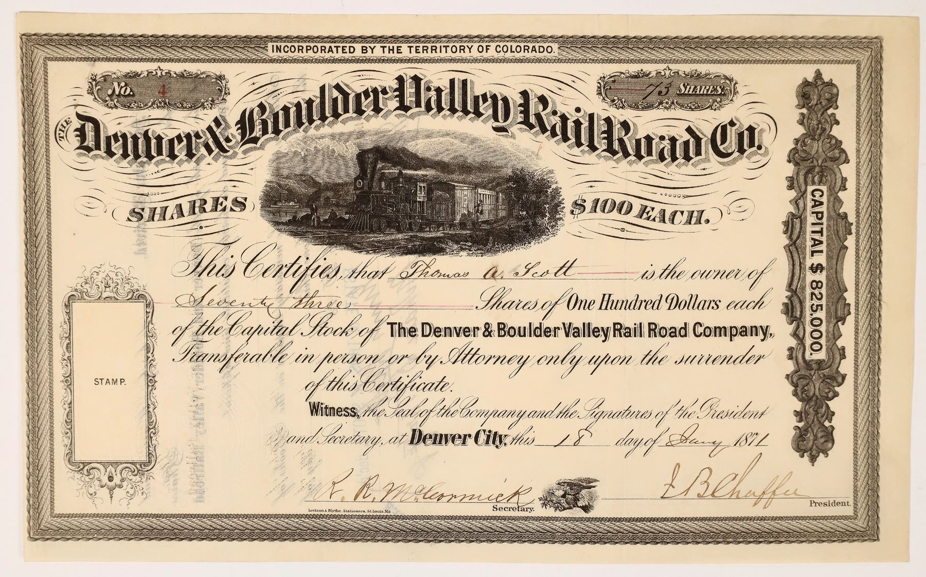 Inc. by the territory of Colorado. Low certificate no. 4, issued to Thomas A. Scott on Jan. 18th, 1871 in Denver City. Signed by JB Chaffee as president and RR McCormick as secretary. Not cancelled. Black border and print with railroad vignette. Signed on the back for the Estate of Thos. A. Scott. Pinholes, folds. 6.5 x 10.75" Thomas Alexander Scott was an American businessman, railroad executive, and industrialist. In 1861, President Abraham Lincoln appointed him to serve as U.S. Assistant Secretary of War, and during the Civil War railroads under his leadership played a major role in the war effort. Scott then became the 4th president of the Pennsylvania Railroad, which became the largest publicly traded corporation in the world. He was considered a "robber baron" and received much criticism for his conduct in the Great Railroad Strike of 1877. In 1877, Scott helped negotiate the Republican Party's Compromise of 1877 with the Democratic Party which settled the disputed presidential election of 1876 in favor of Rutherford B. Hayes in exchange for the federal government pulling out its military forces from the South and ending the Reconstruction era. Jerome B Chaffee was one of the founders of the City of Denver, and founded the First National Bank of Denver in 1865. Chaffee entered politics and helped organize the Colorado Territory, serving in its first legislature as speaker. He was the territorial delegate to the United States Congress starting in 1870. In 1876, after Colorado was admitted to the Union, Chaffee was elected to the United States Senate. Chaffee County in Colorado is named after him. According to Poor's Manual of Railroads (1887), this company operated a line from Brighton, Colorado to Boulder, a distance of 27 miles. Chartered in 1870; opened in 1871. Operated by the Union Pacific after the company defaulted in 1879.