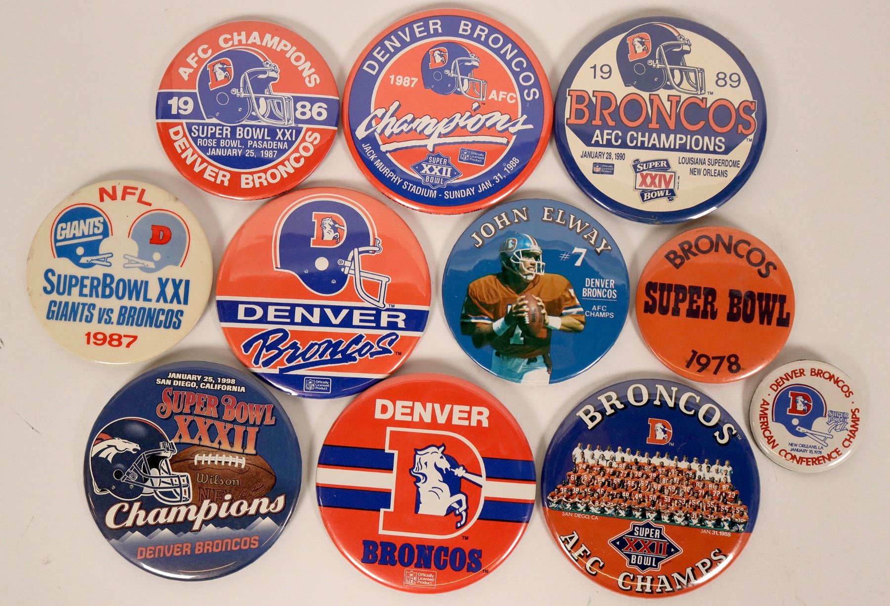 This is a collection of eleven (11) pinbacks of the Denver Broncos NFL team plus one John Elway #7 pin at 3in. diam. Broncos pins 1986 AFC Champs, 1987 AFC Champs, 1989 AFC Champs, Super Bowl Champs 1998, Super Bowl Champs 1988, Super Bowl 1978, AFC Champs 1978, plus two team color Broncos pins. Most are 3 in. diameter. Please see photos for details.