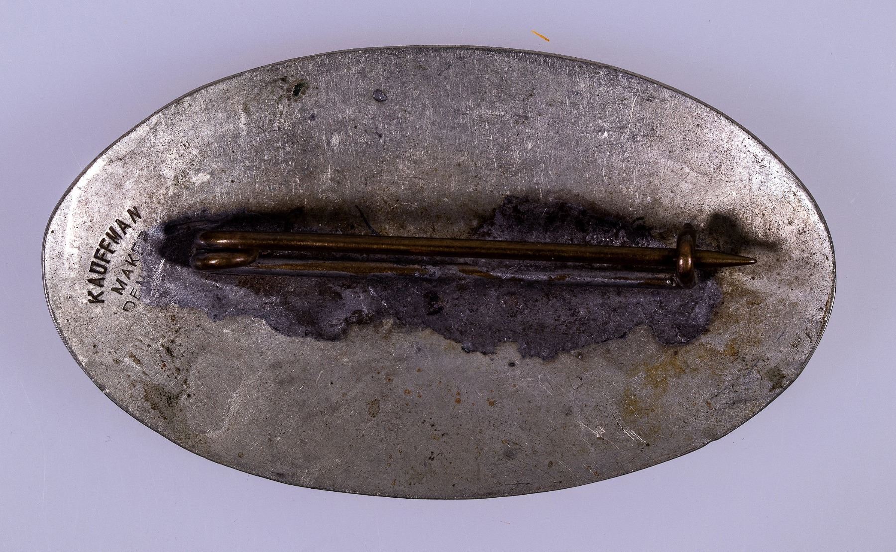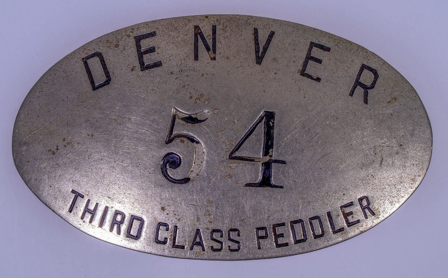 Oval white metal Denver, 54, Third Class Peddler badge. Pin clasp on rear. 3x1.75".