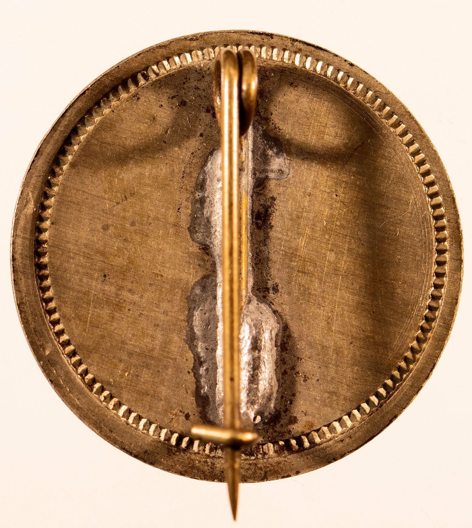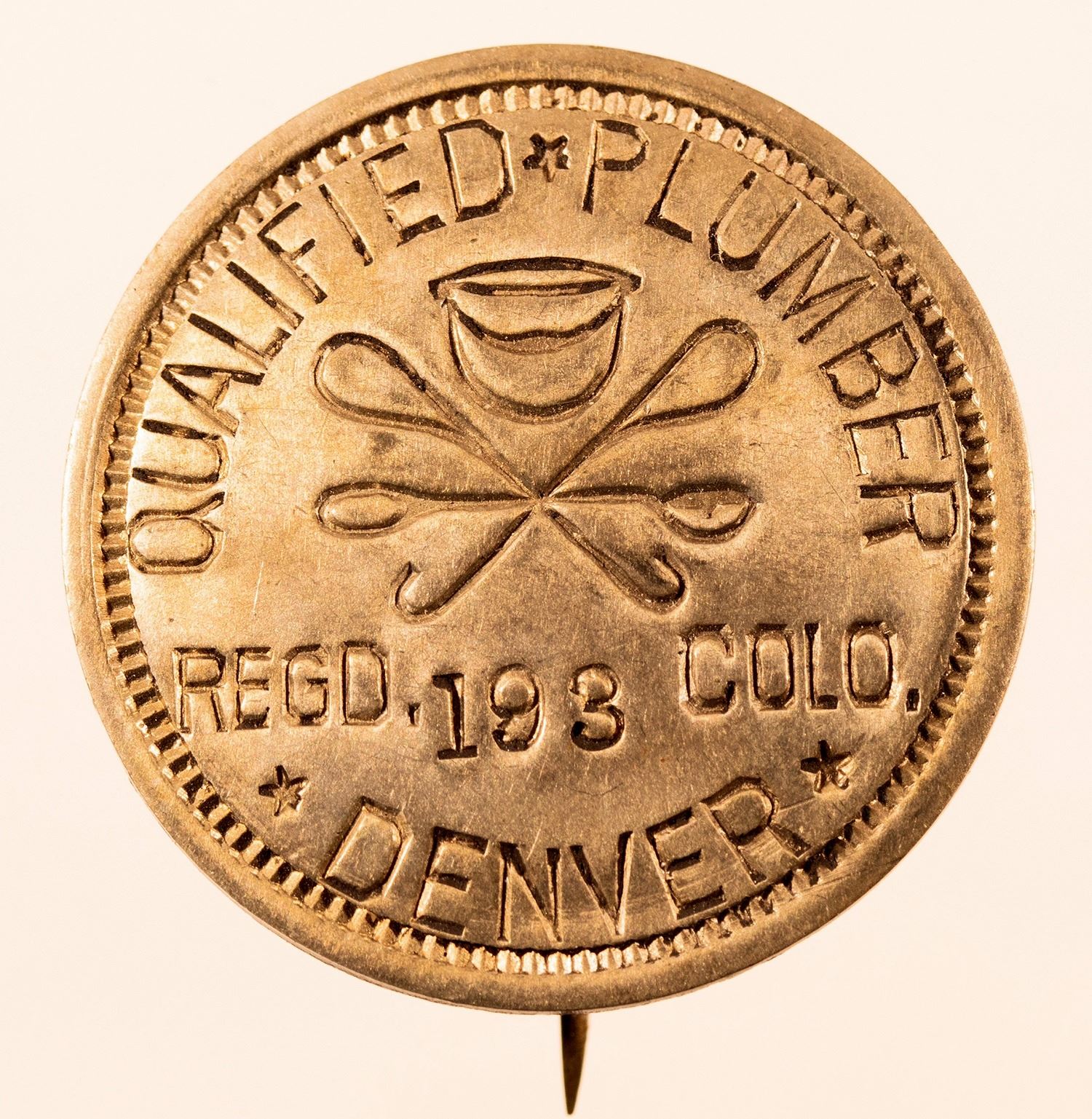 Round white metal plumber badge. Qualified*Plumber, Regd. 193 Colo., Denver