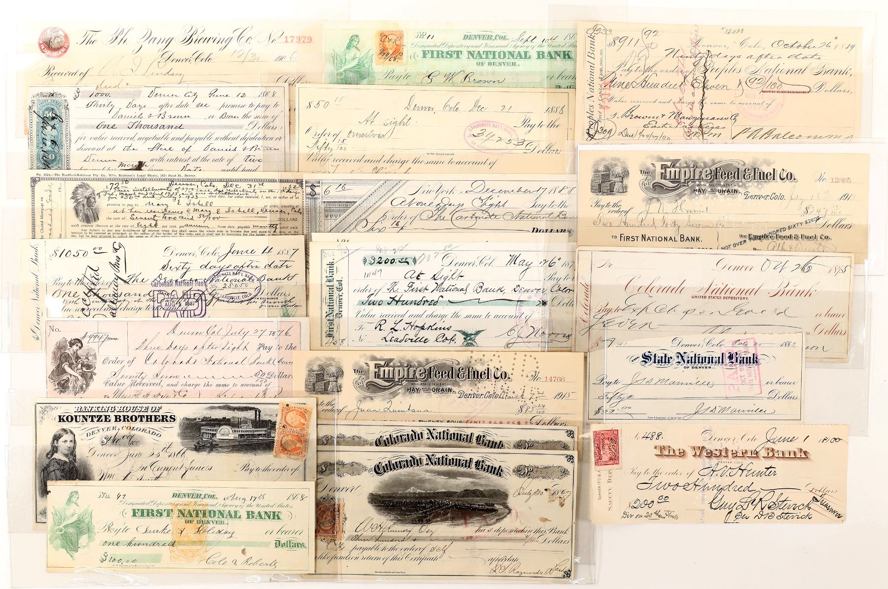 19 Denver checks, c. 1868-1932, some with adhesive stamps. First National Bank, Empire Feed and Fuel, Colorado National Bank, Western Bank, Kountze Brothers, etc.