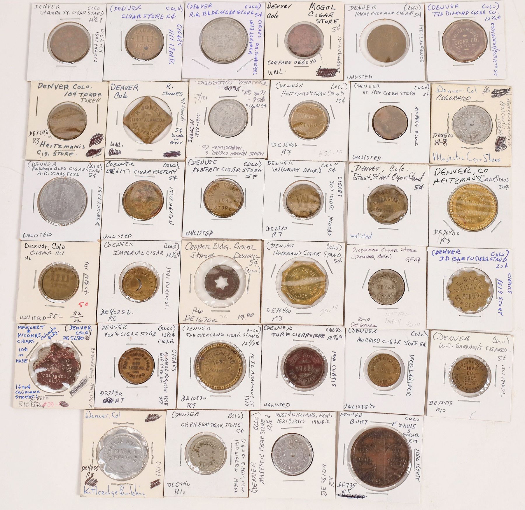 Thirty four Denver tokens from cigar stores: Imperial Cigar; Cooper Bldg. Cigar Stand; Fox's Cigar Store; Morris's Cigar Store; Roberts Cigar Store and many more.