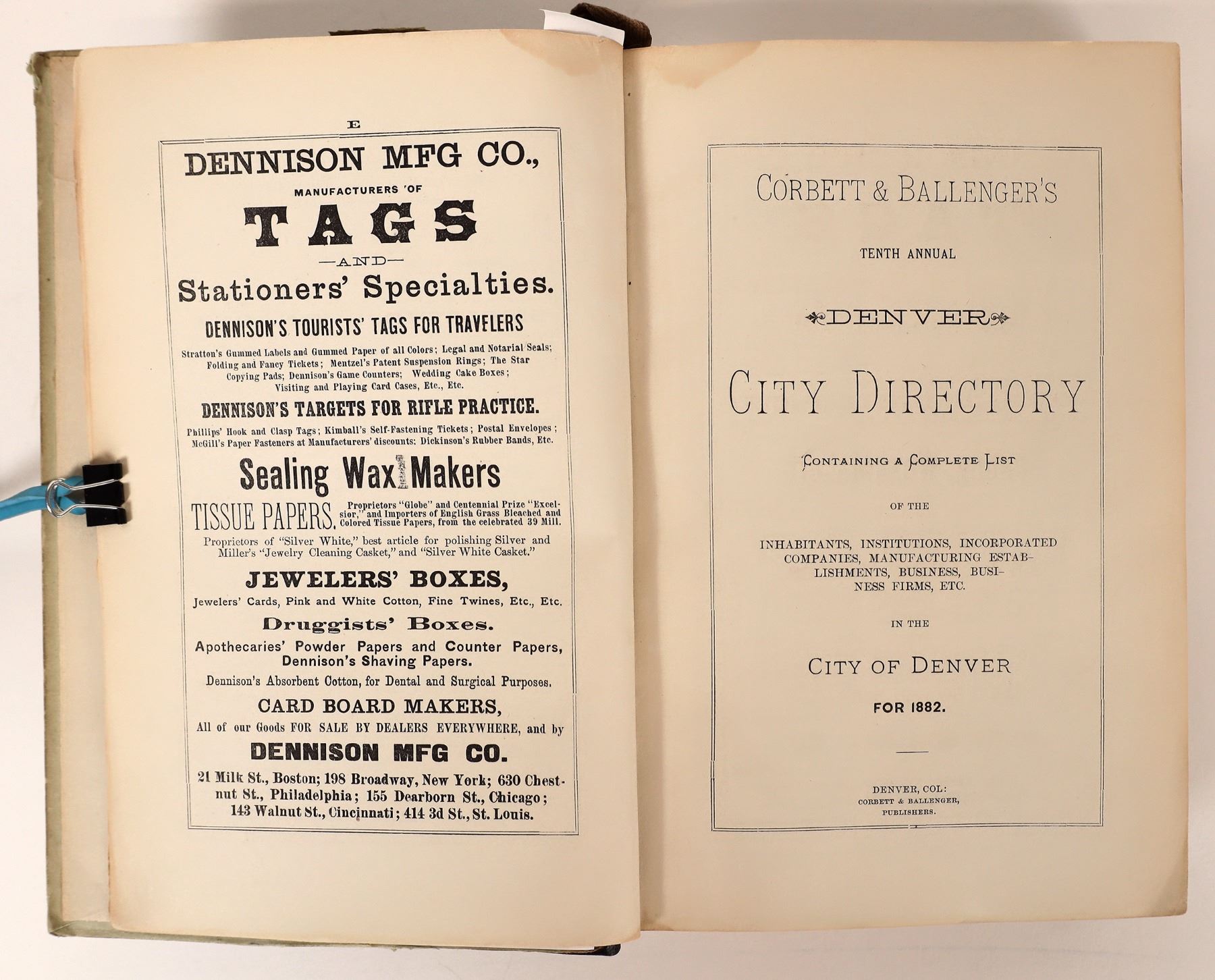 Corbett & Ballenger's Denver City Directory, 1882. 675pp, John Ford (the great numismatist) bookplate in front inside cover. Tenth Annual directory. Its got everything- banks, assayers, mining companies,the works. A great and rre reference. Denver Colorado 1882